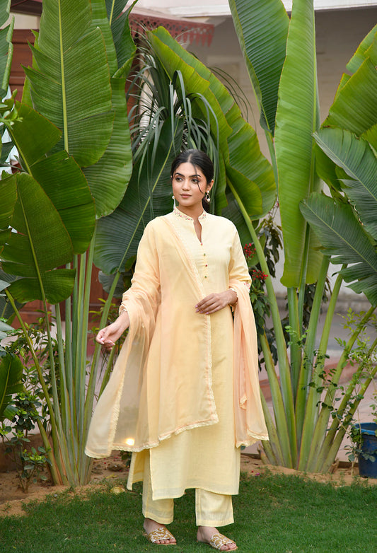 Cotton Yellow Straight Fit Embroidered Collar Kurta Set