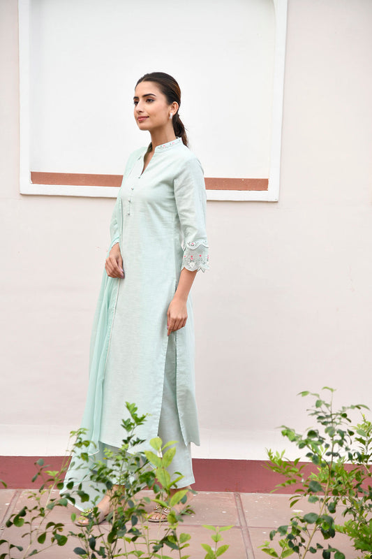 Green Mandarin Collared Straight Embroidered Kurta Set