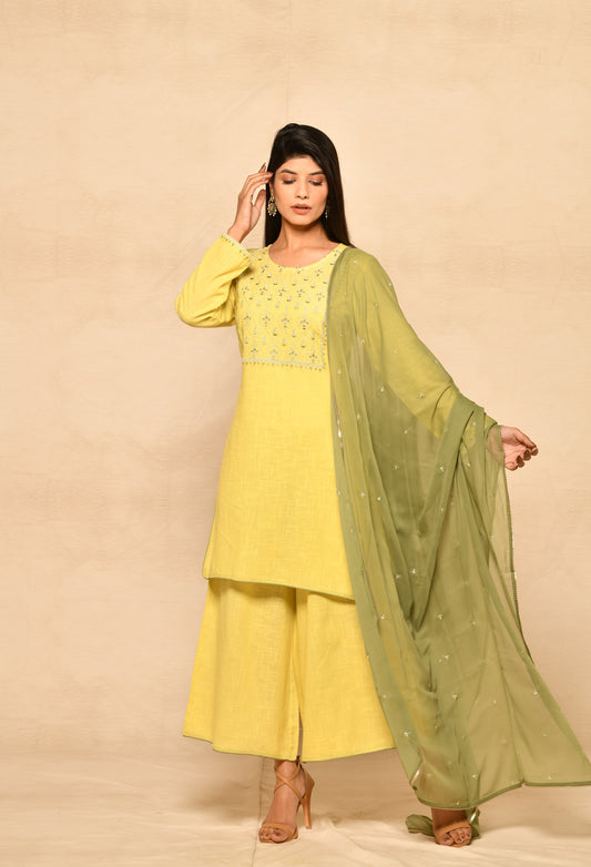 Lime Yellow Embroidery Short Kurta Set With Palazzo & Dupatta