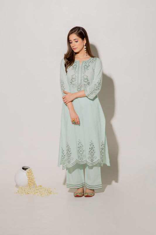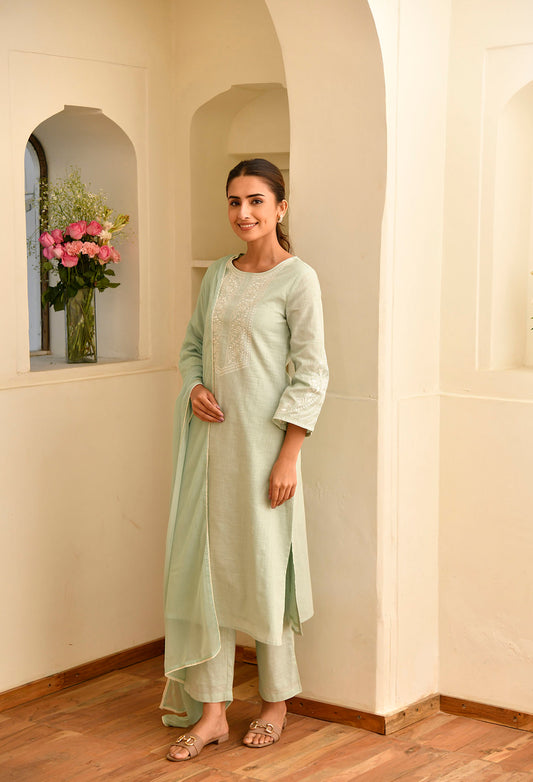 Green Mandarin Collared Straight Embroidered Kurta Set