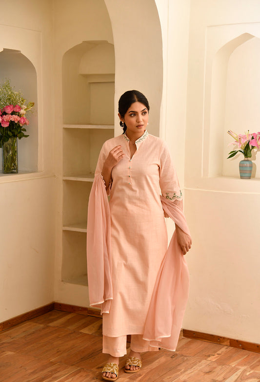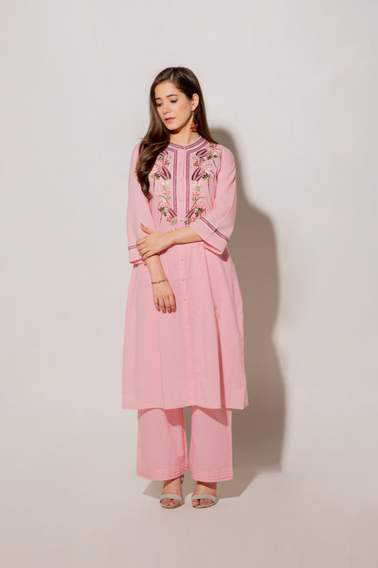 Pink A-line Cotton Kurta Set With Embroidery Details