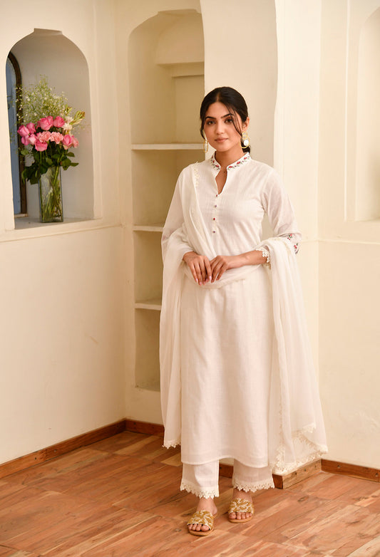 White Straight Fit Embroidered Collar Kurta Set With Organza Detail