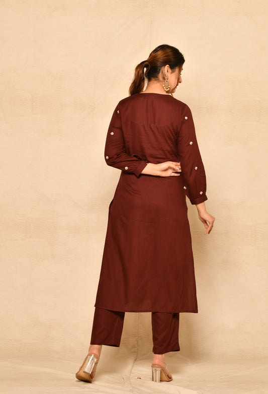 Wine Straight Kurta Set With Floral Embroidery Details