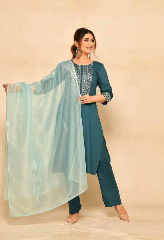 Teal Blue Straight Kurta Set With Yoke Embroidery