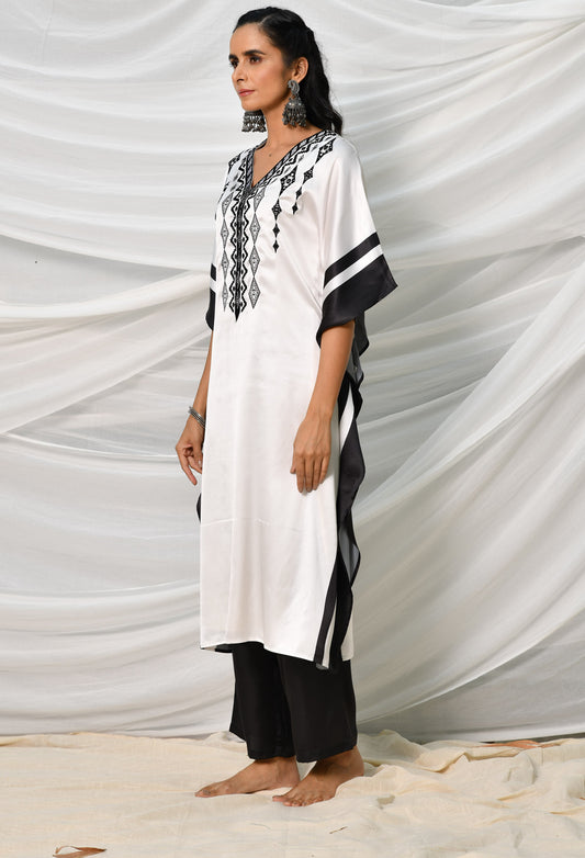 Black & White Embroidered Satin Kaftan Set