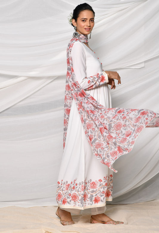 White Moss Fabric Gathered Kurta Set With Detailed Print