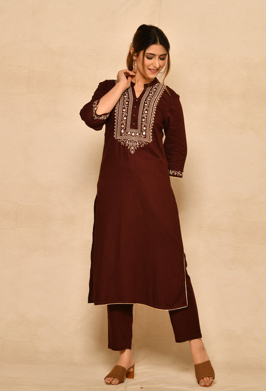 Wine Viscose Straight Kurta Set With Yoke Embroidery.