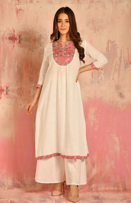 White A-line Cotton Kurta With Embroidered Yoke Details