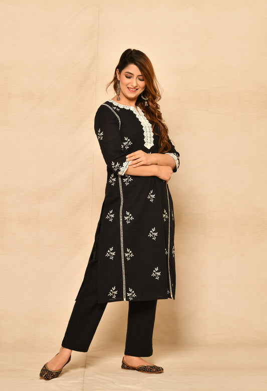 Black Straight Kurta Set With Embroidery And Laces.
