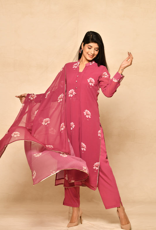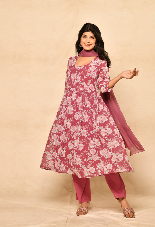Pink Embroidery Printed Gathered Kurta Set