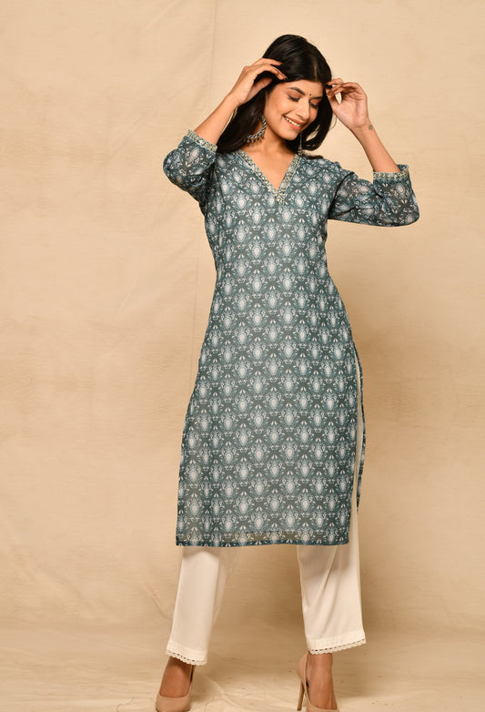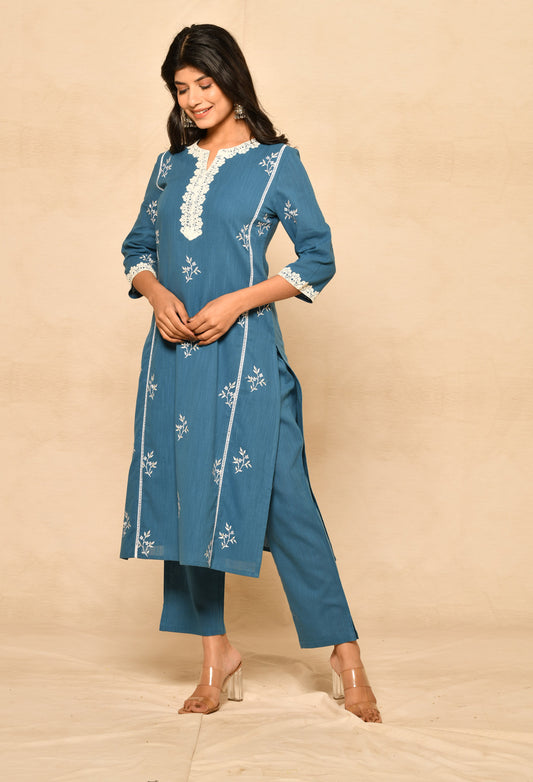 Blue Cotton Straight Kurta Set With Embroidery & Lacework
