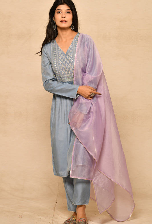 Blue Cotton Silk Gathered Kurta Set With Yoke Embroidery