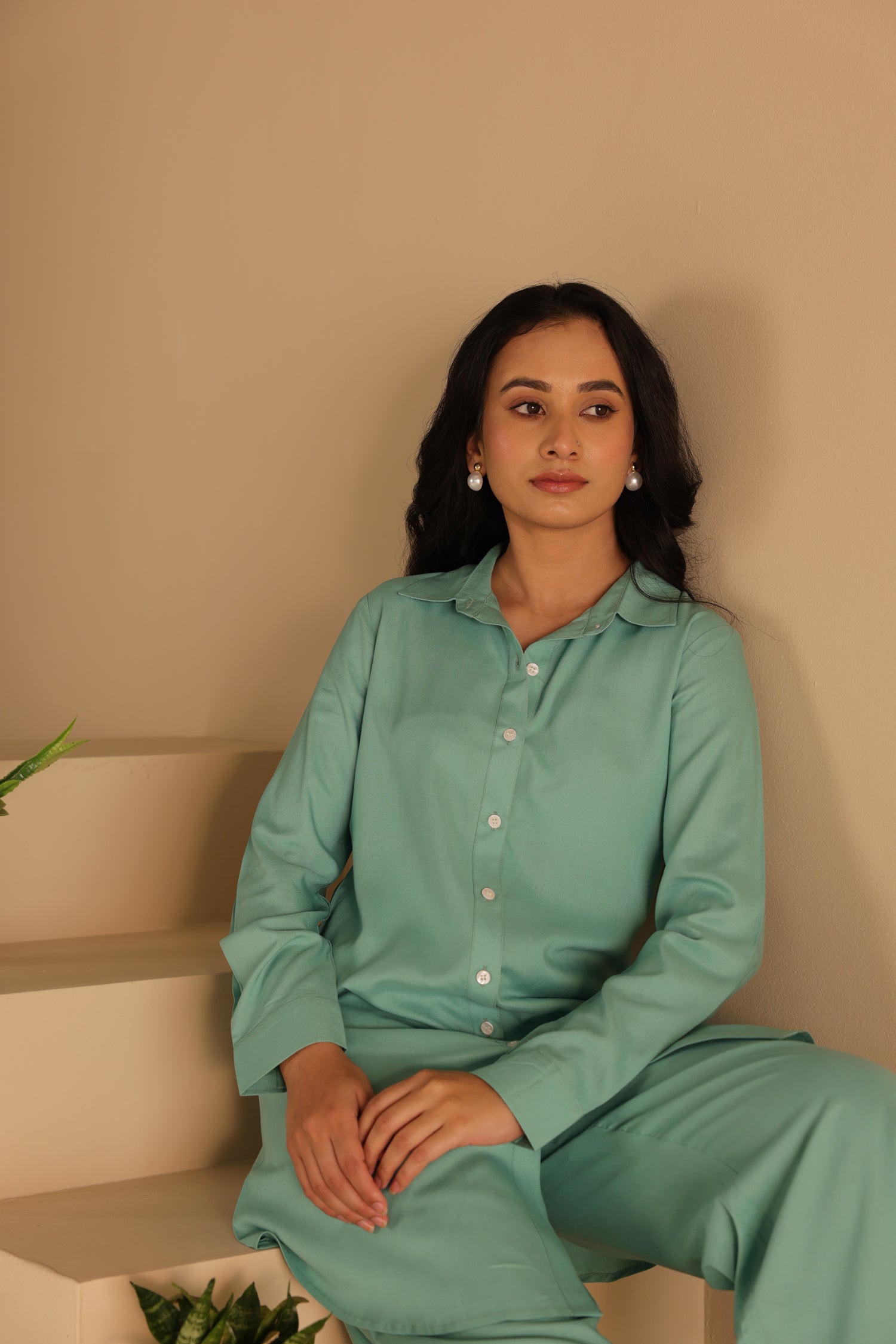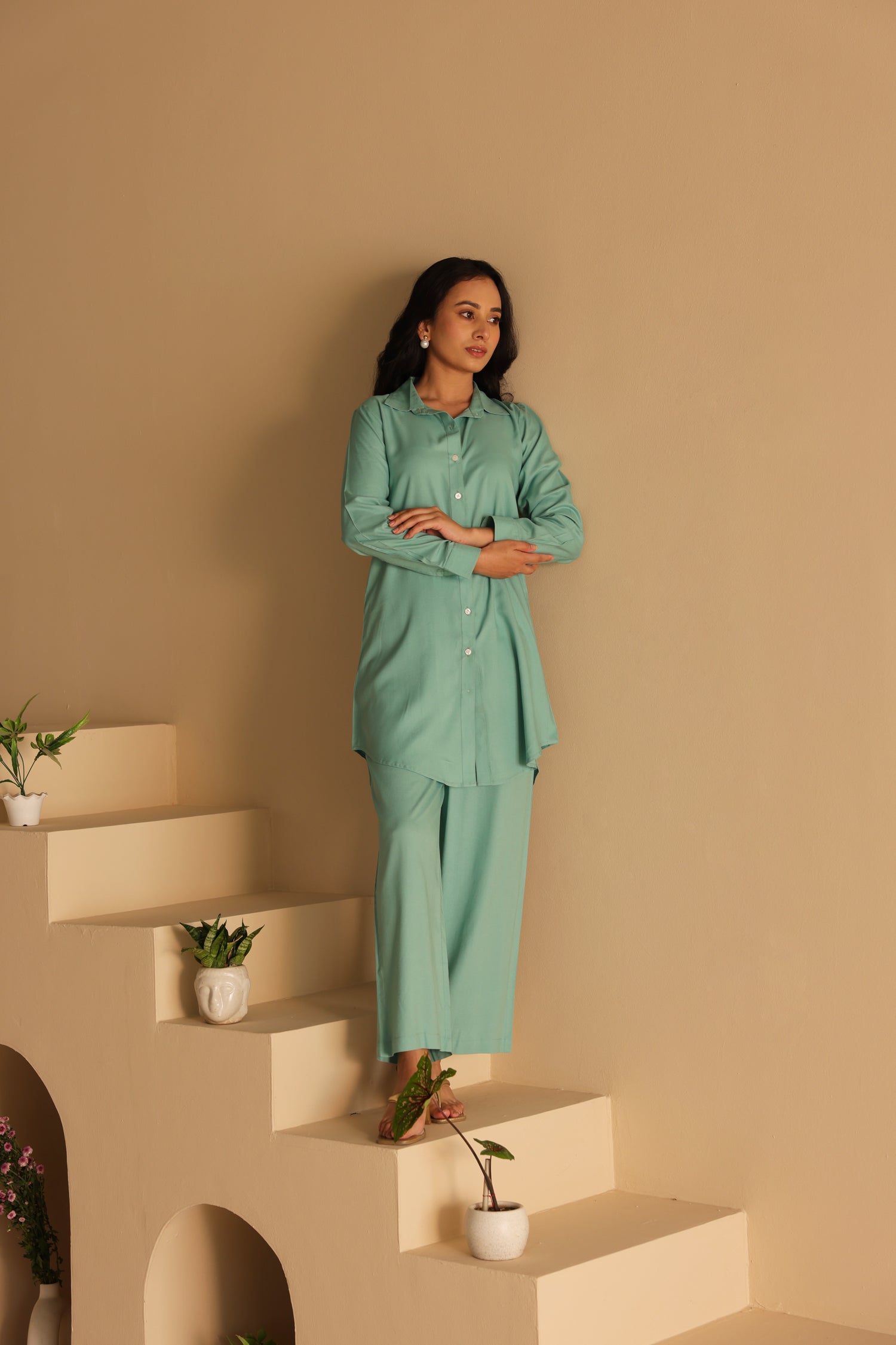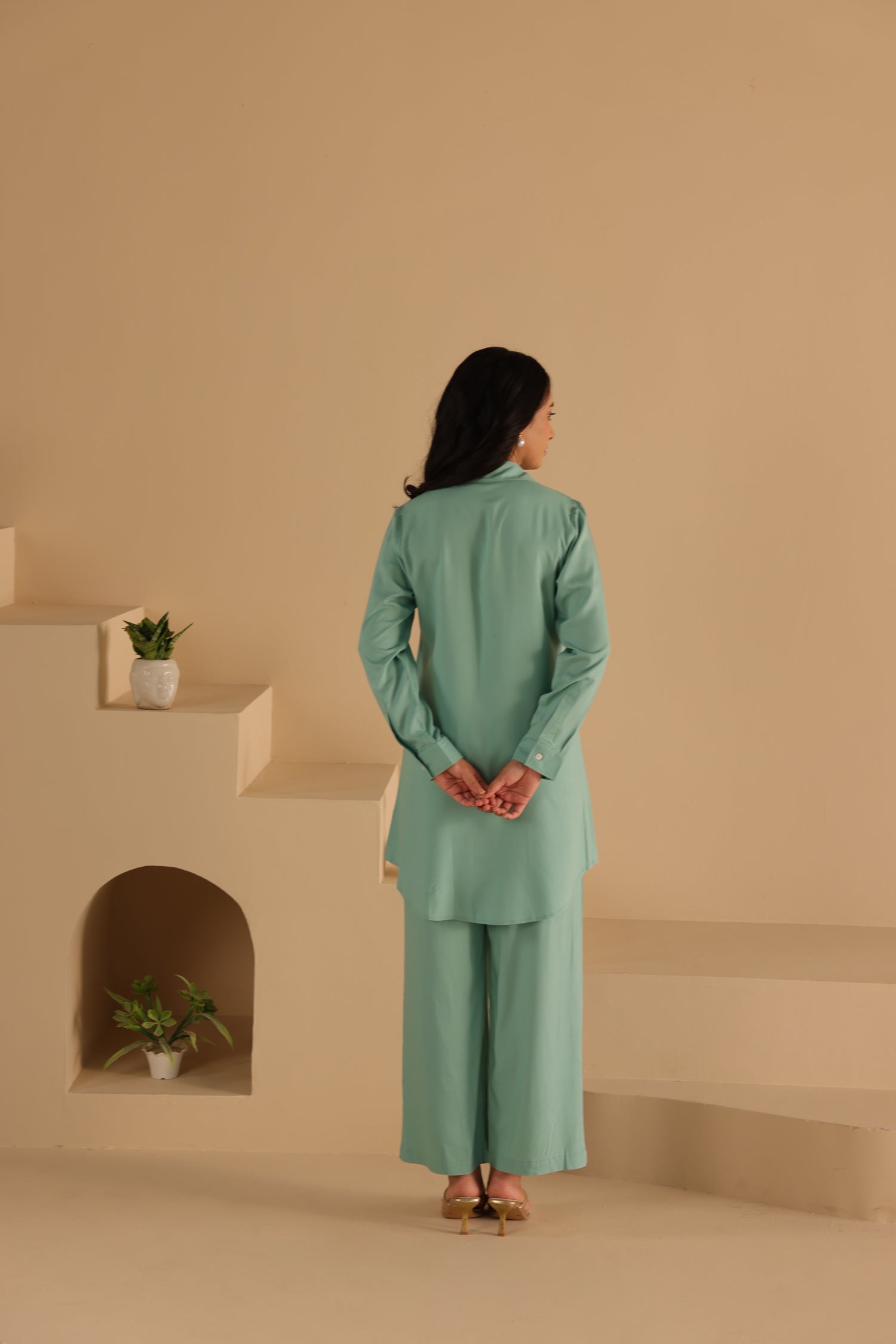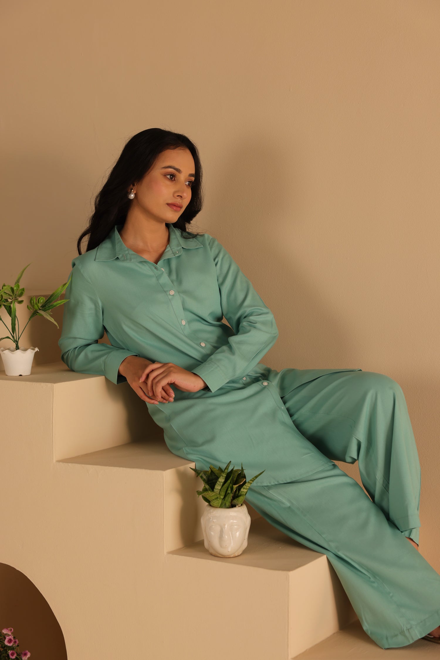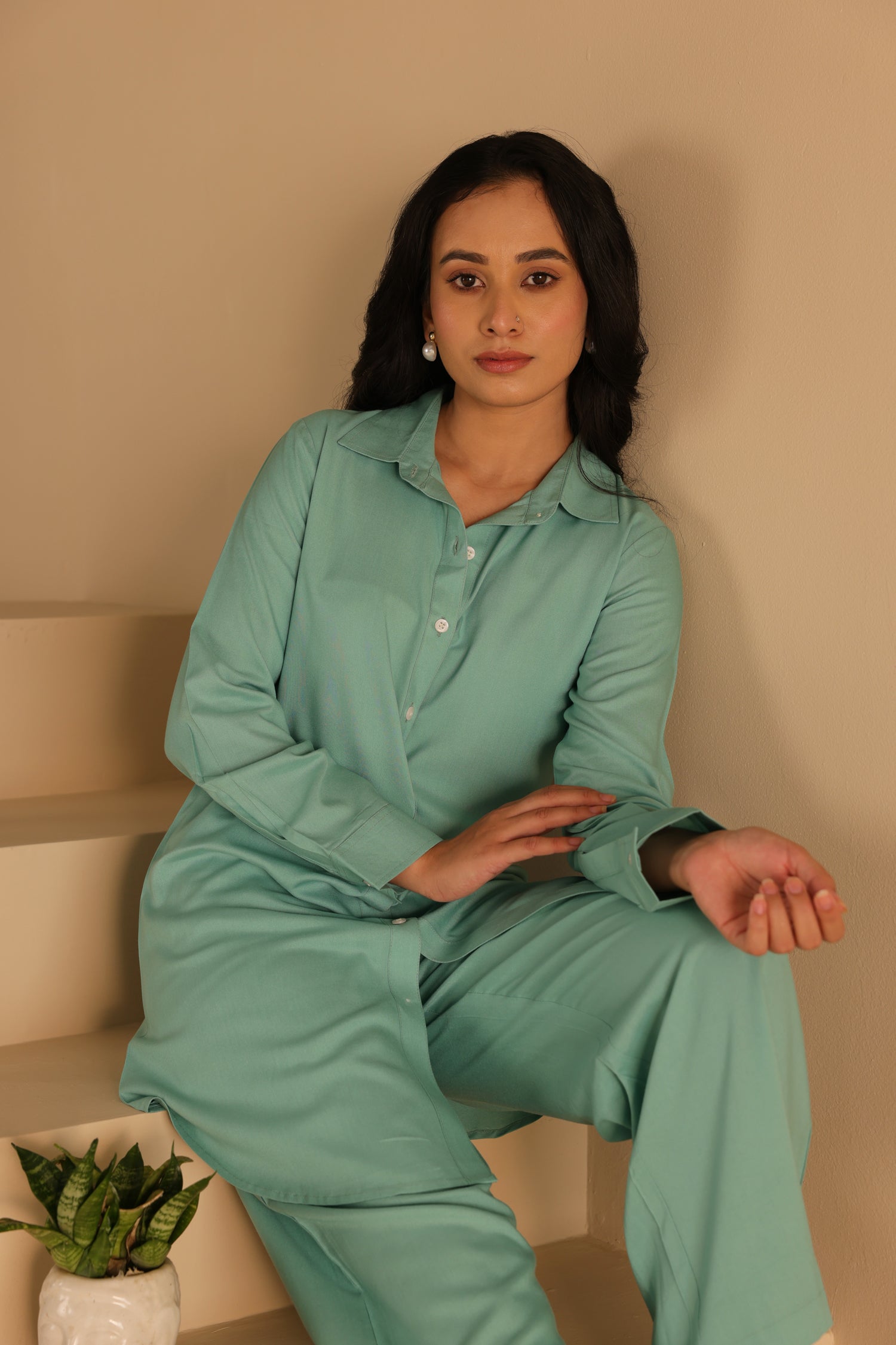 Our aqua bliss co-ord set featuring a button-down long shirt with a relaxed fit and sleek detailing, paired with tailored straight-fit pants for a chic and versatile look.