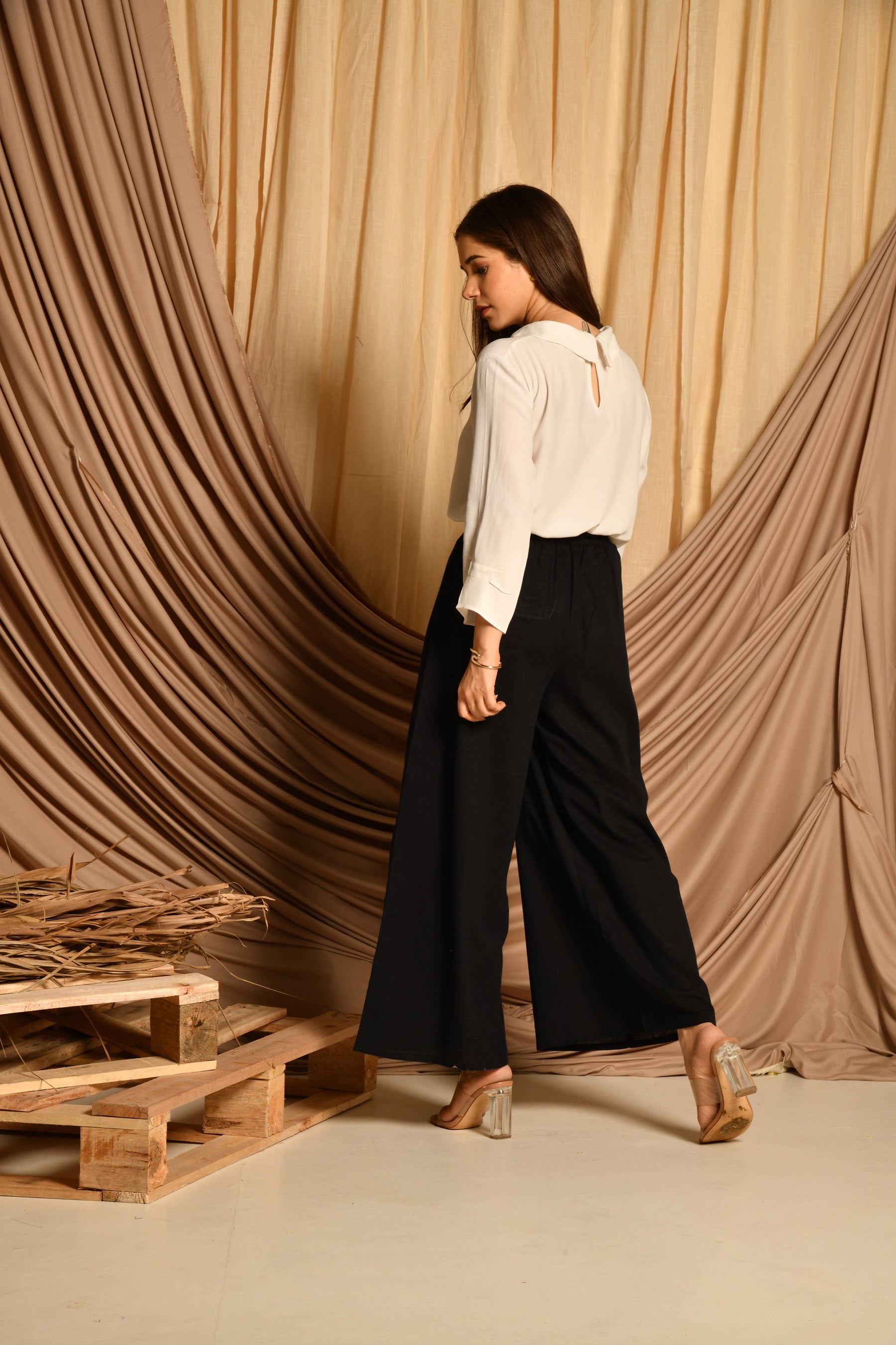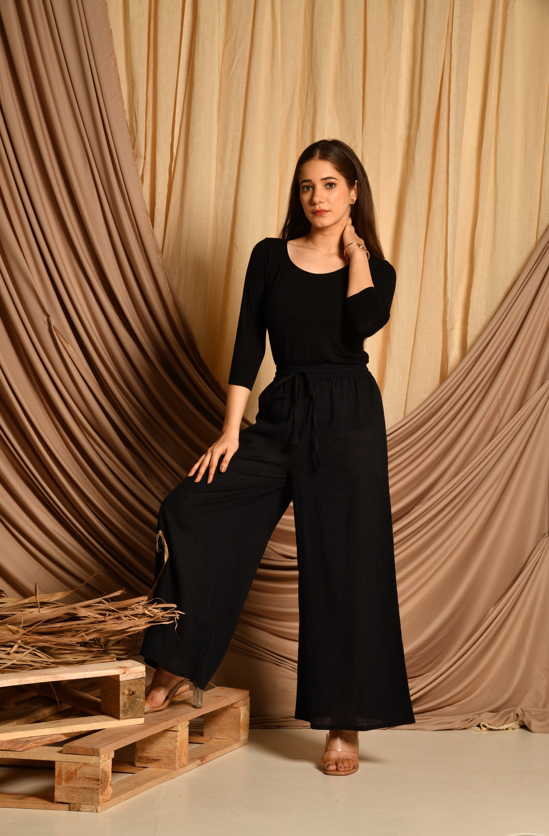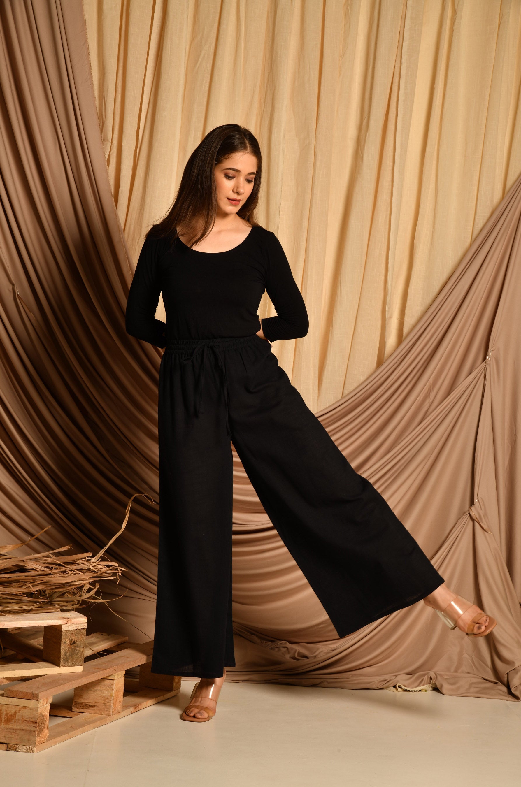 • Pattern: Black cotton pallazo with elasticated belt and drawstring.
