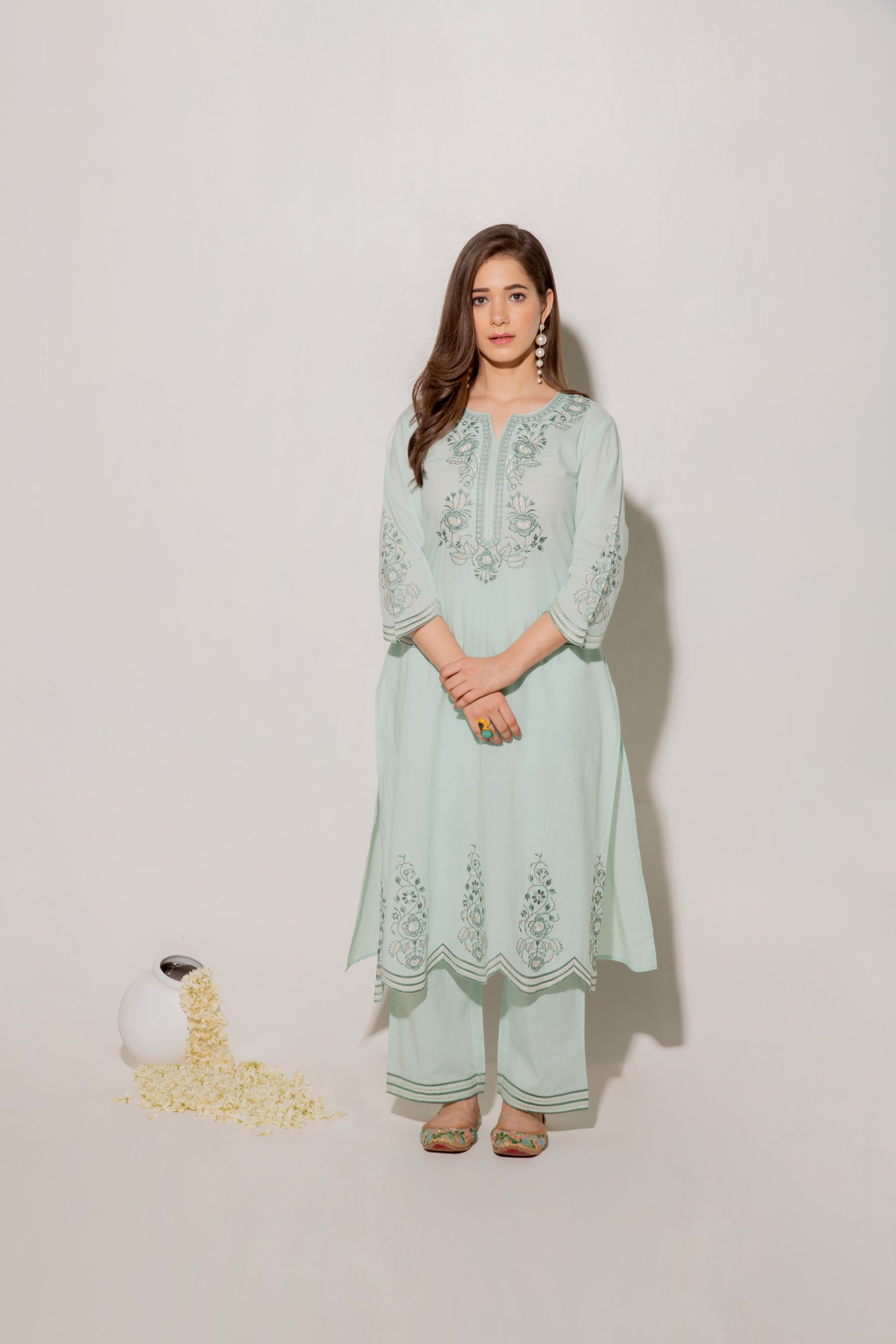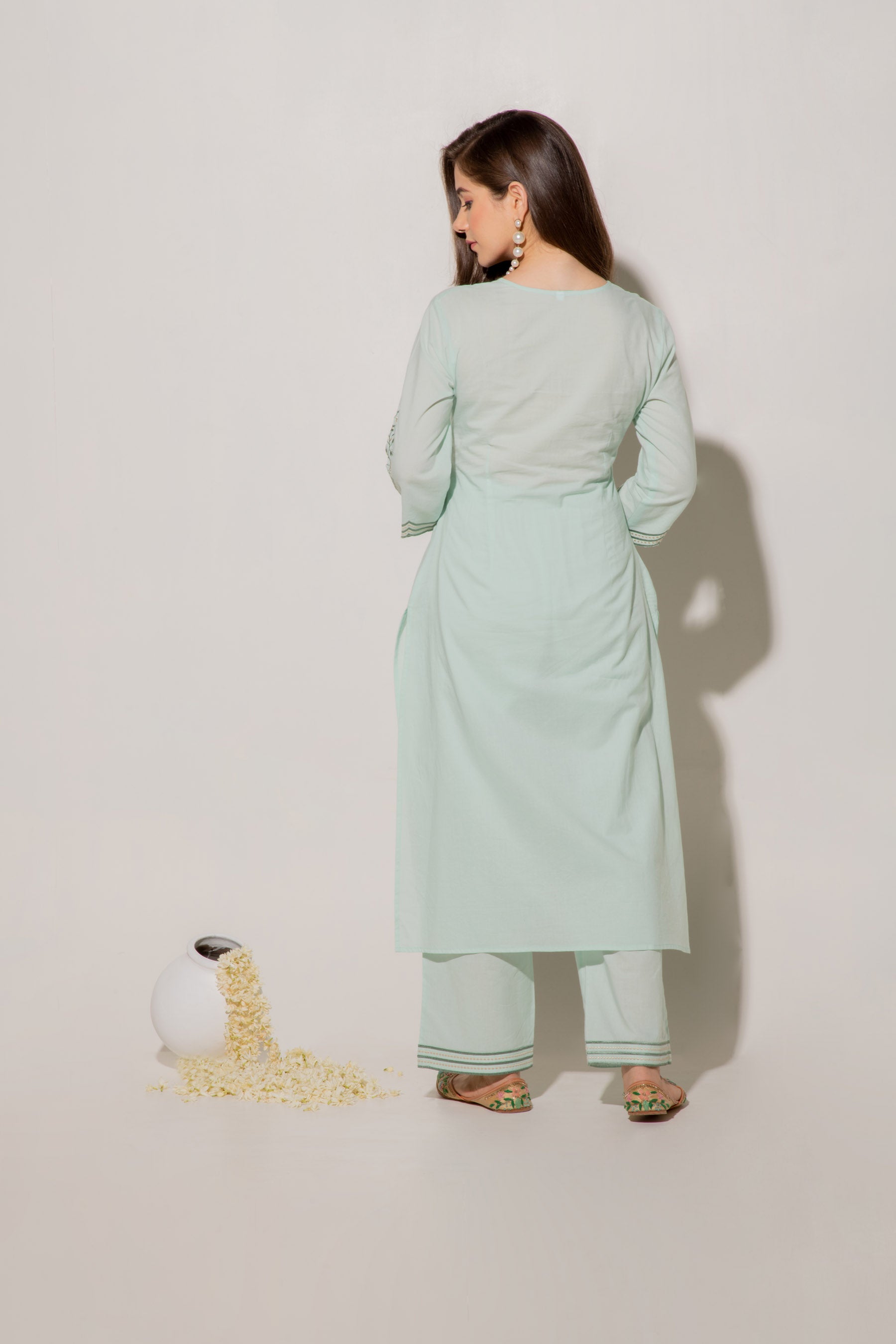Green Mandarin Collared Straight Embroidered Kurta Set