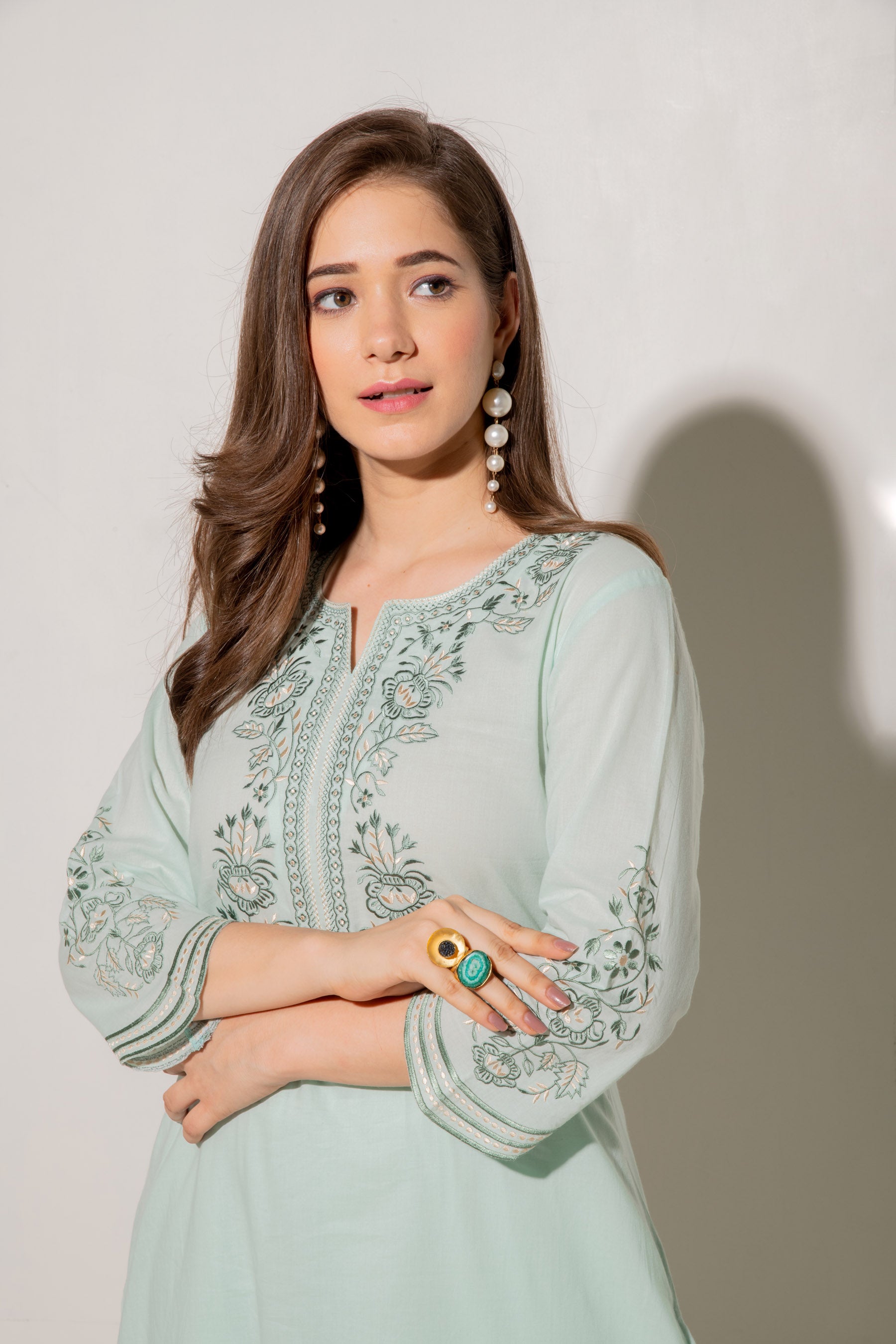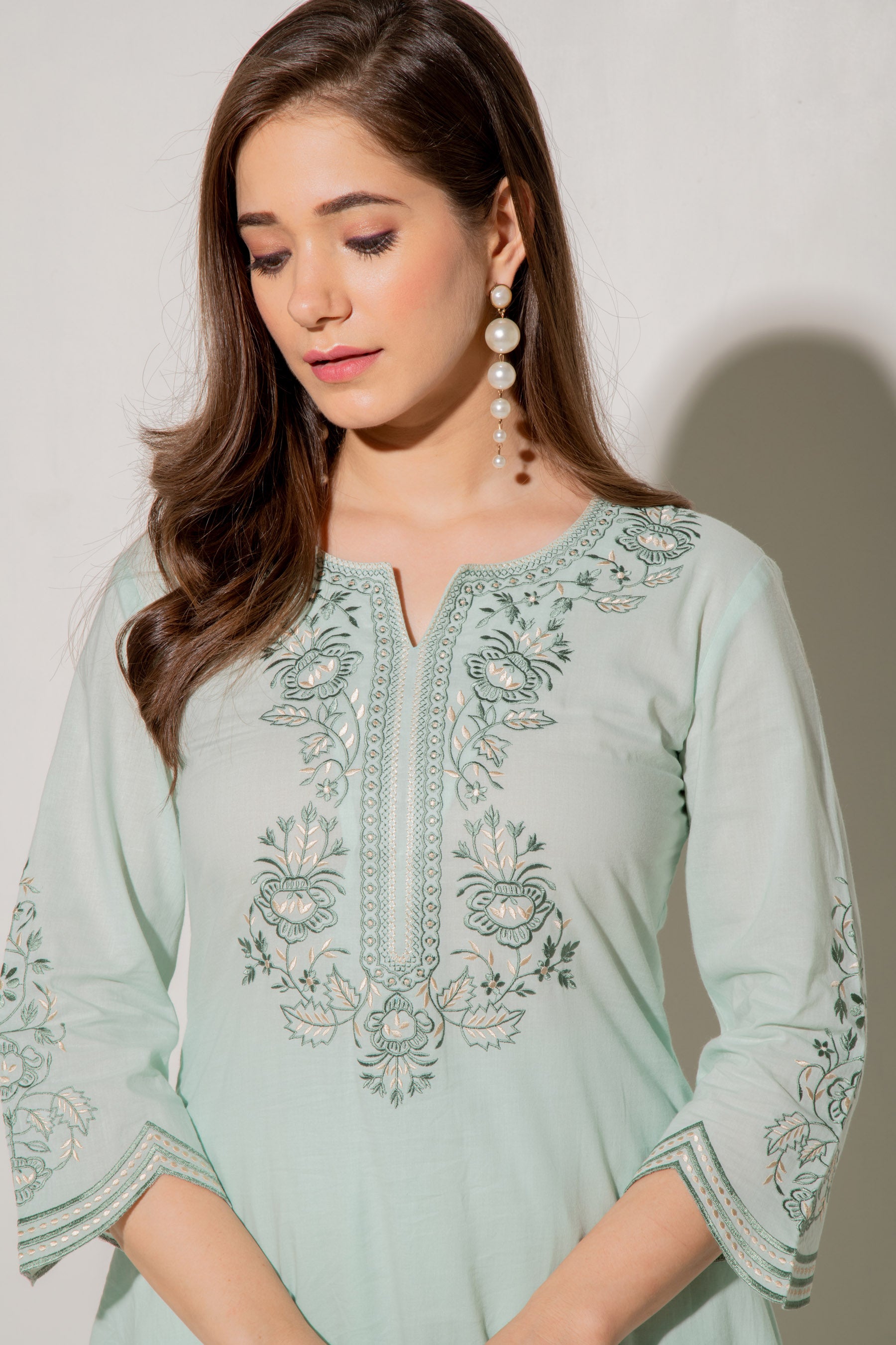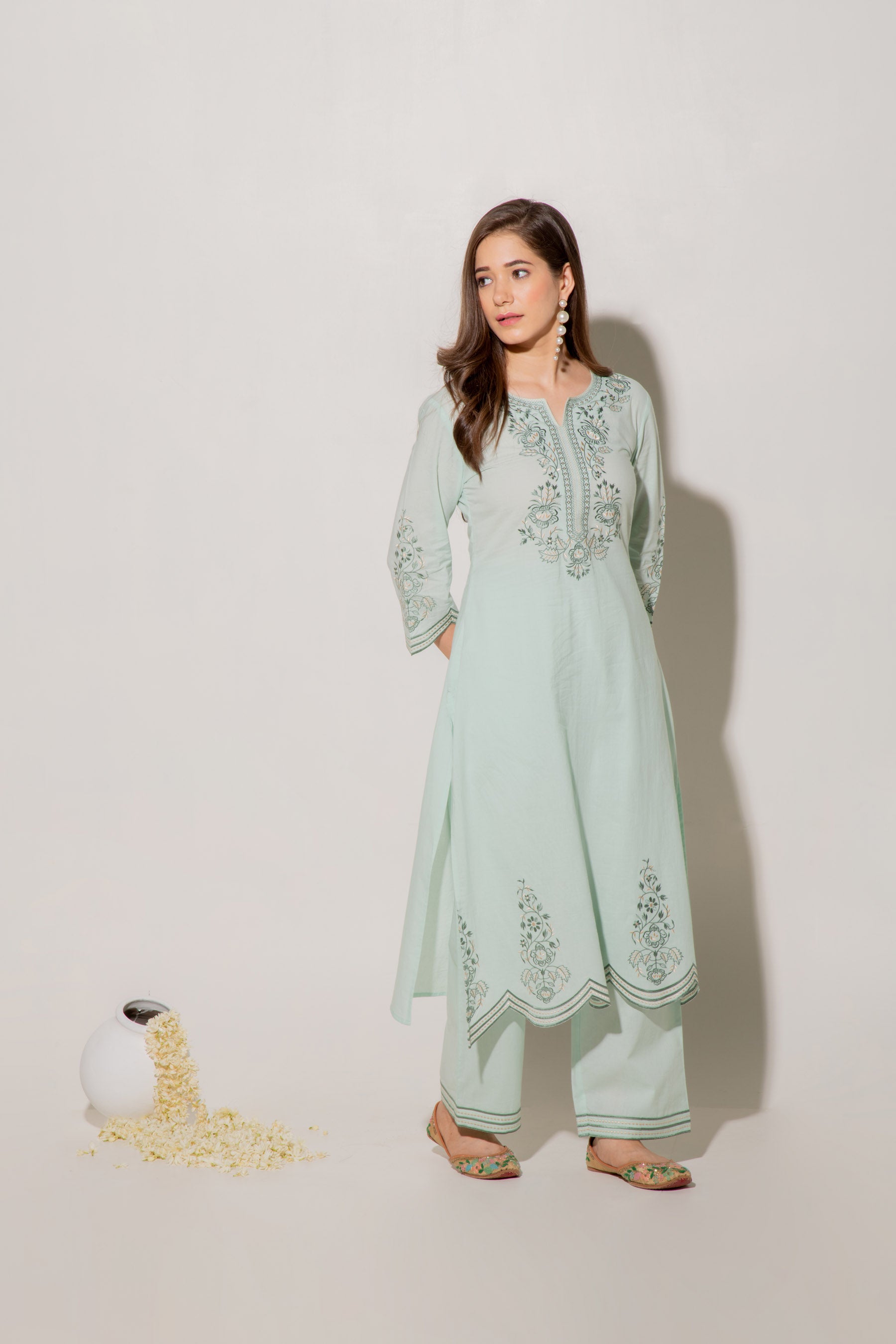 • Pattern: A-line cotton kurta set with embroidery details, cutwork details, paired up with pants.