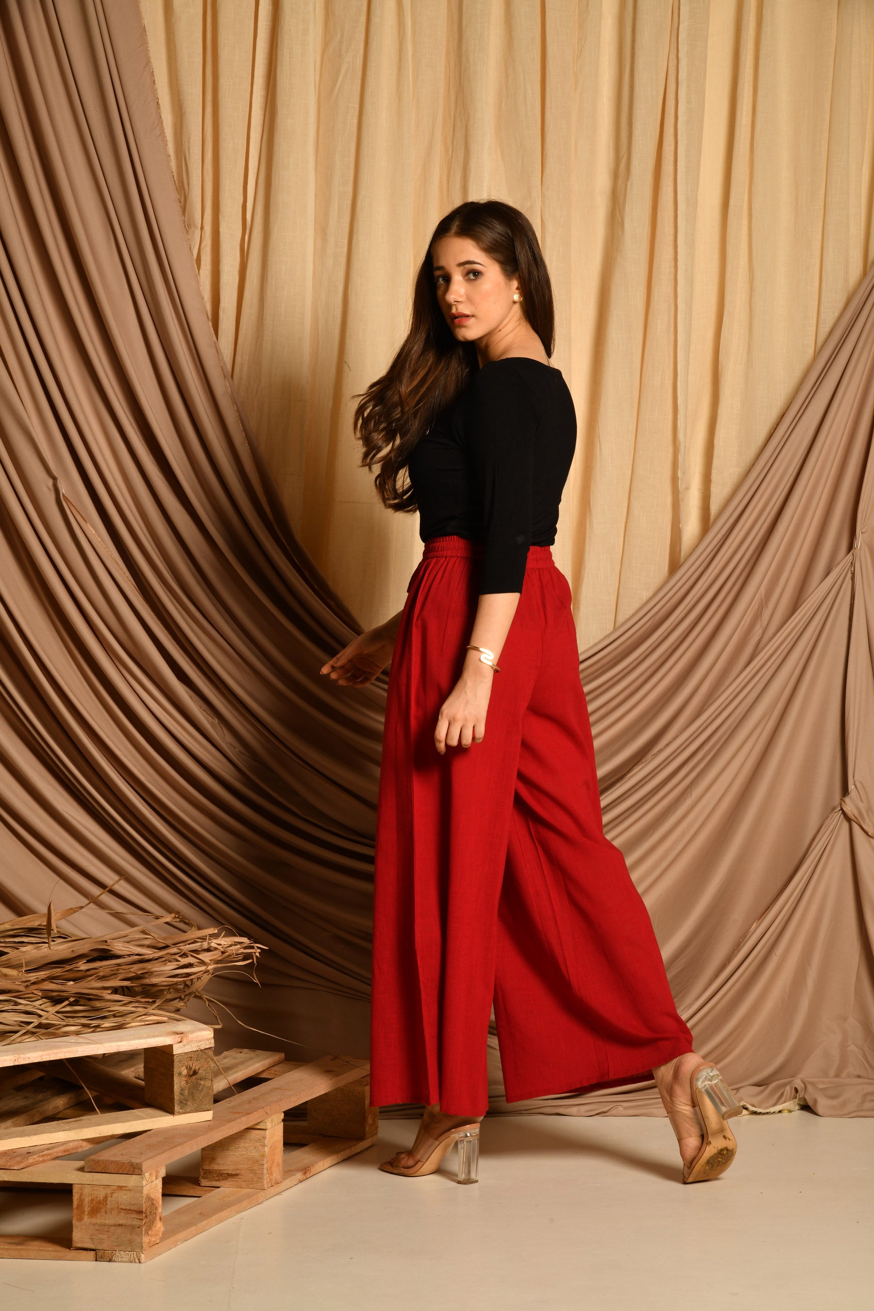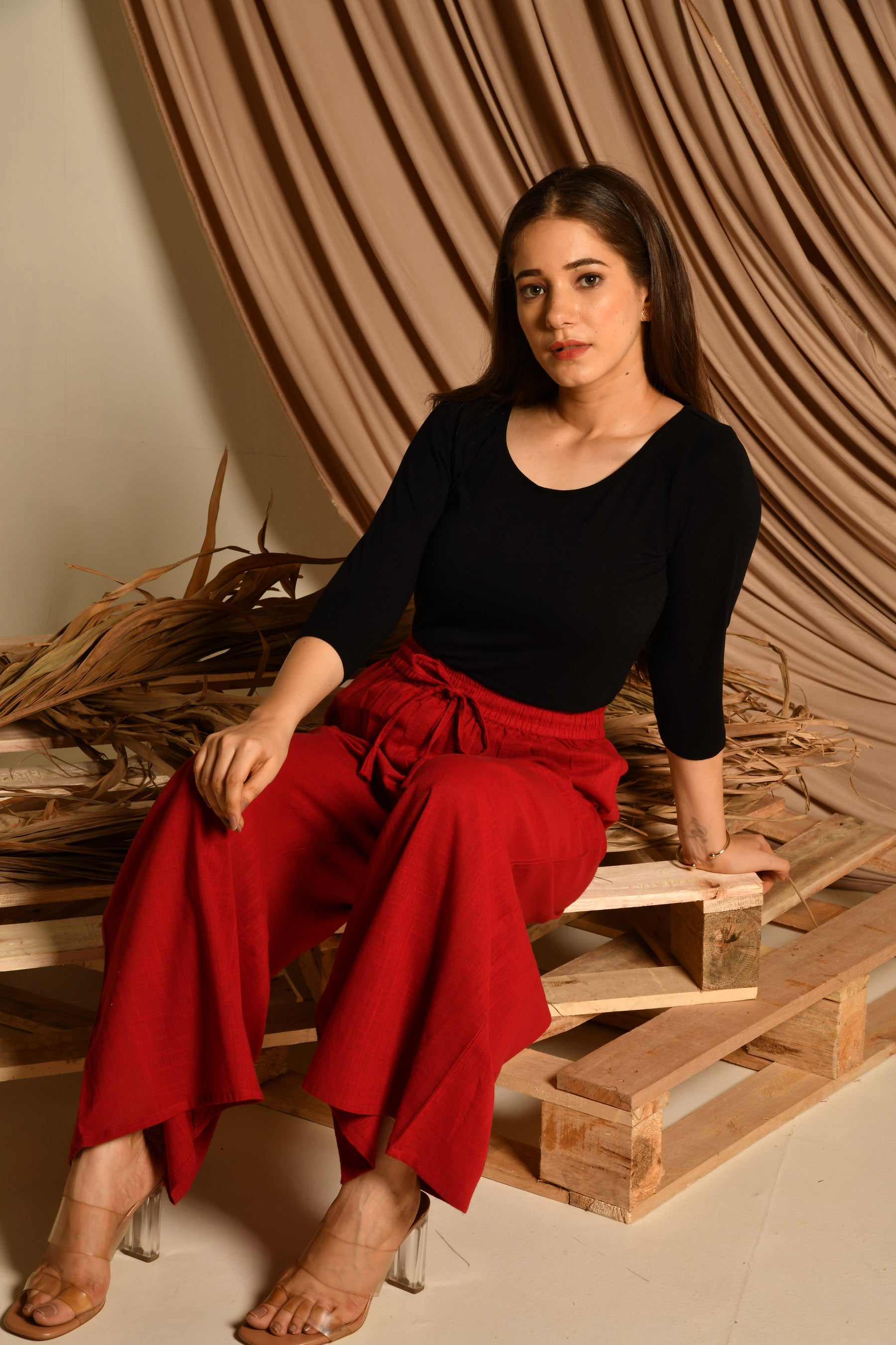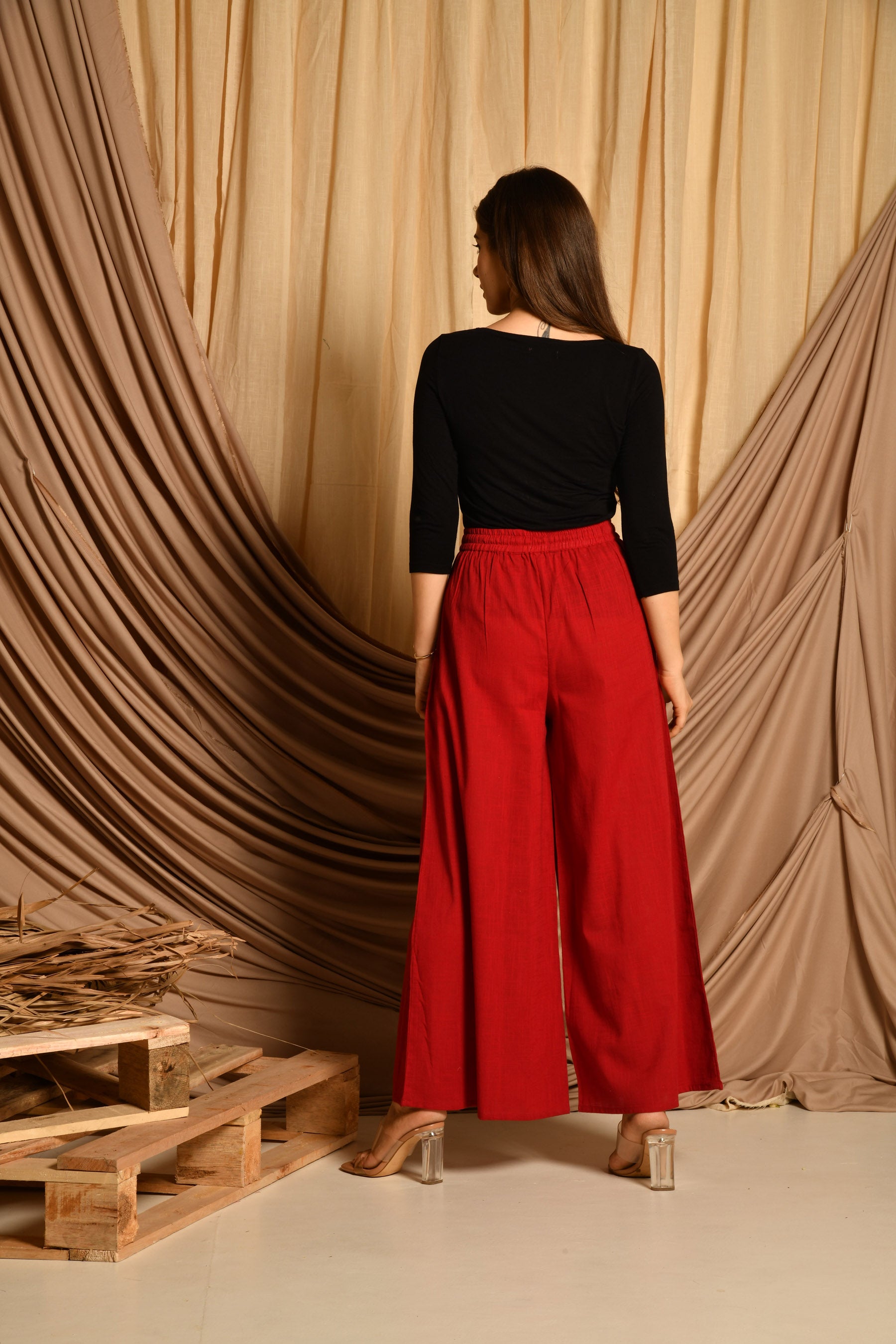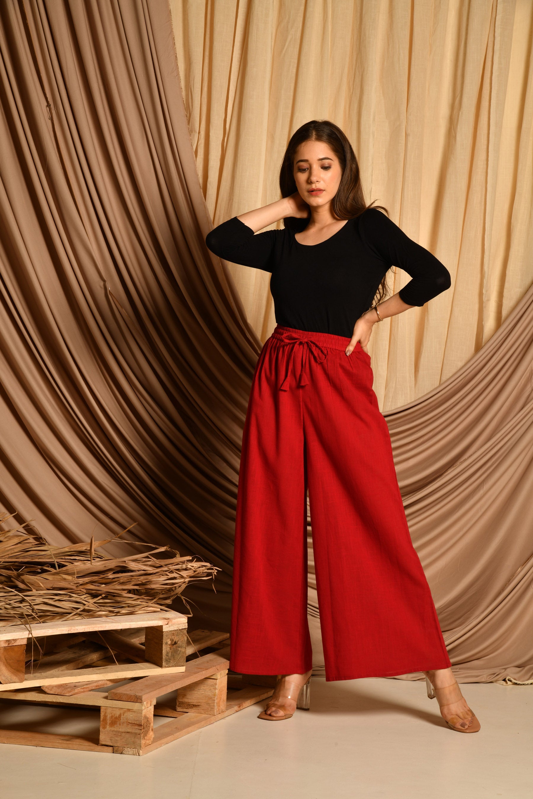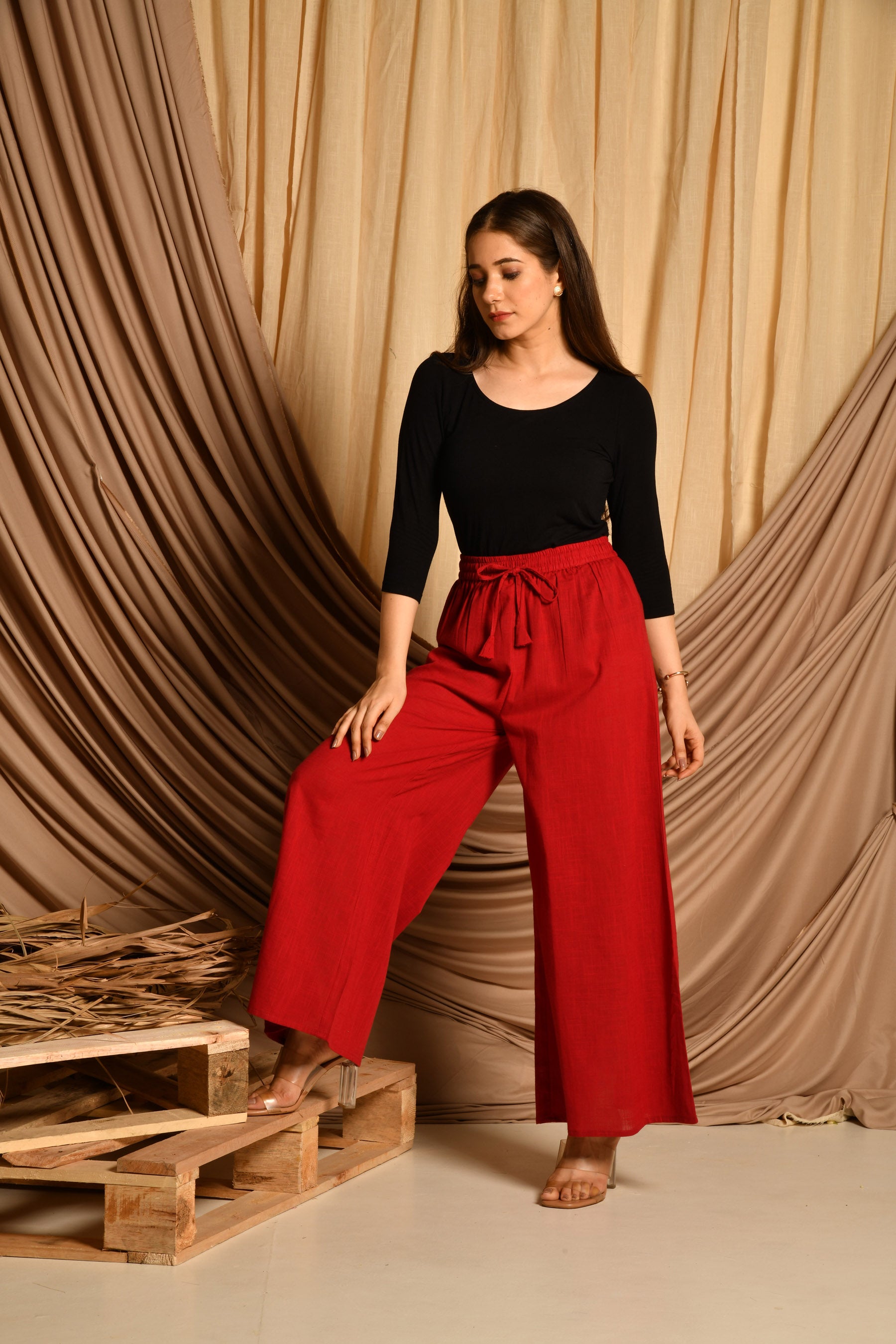 • Pattern: Maroon cotton pallazo with elasticated belt and drawstring.