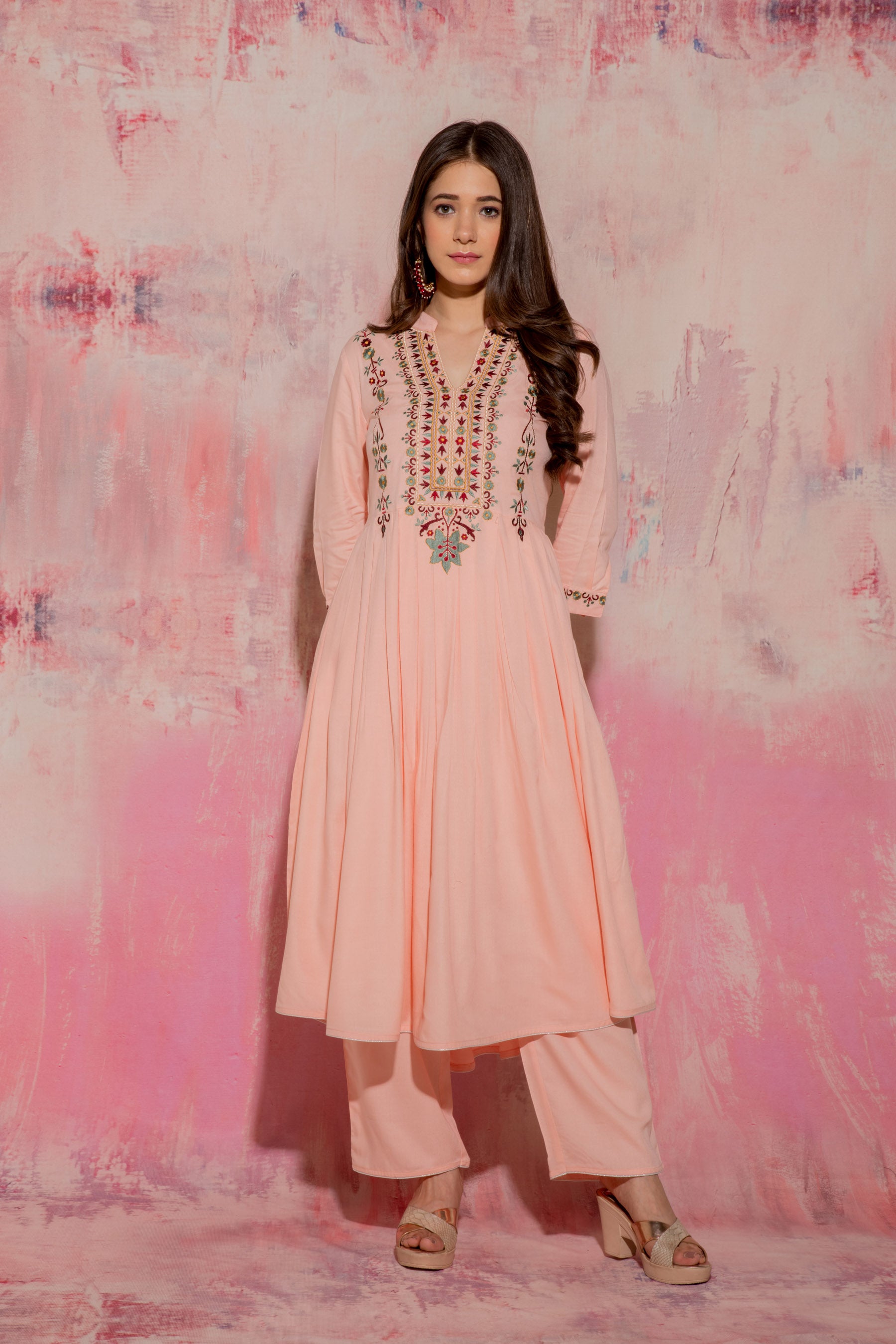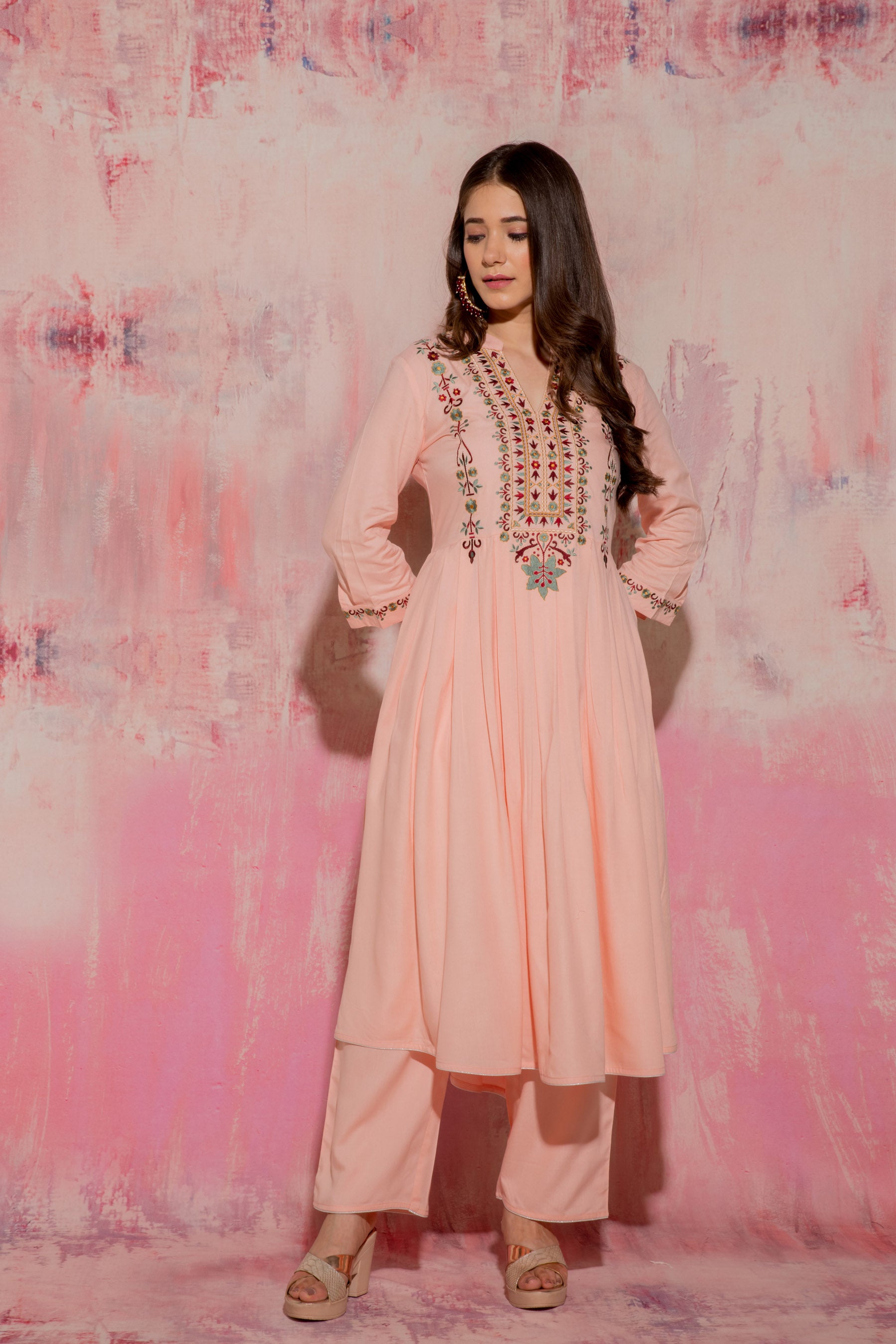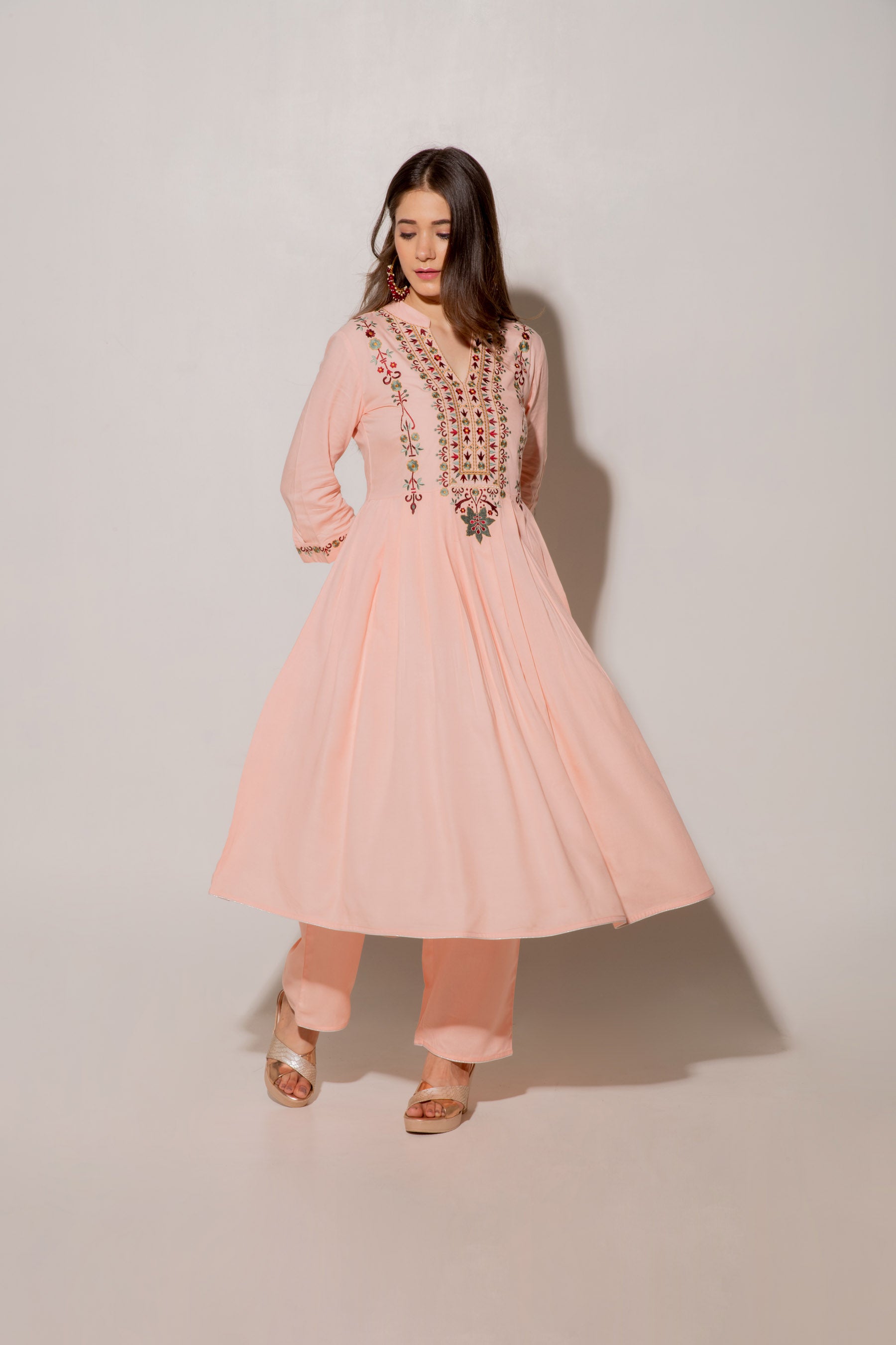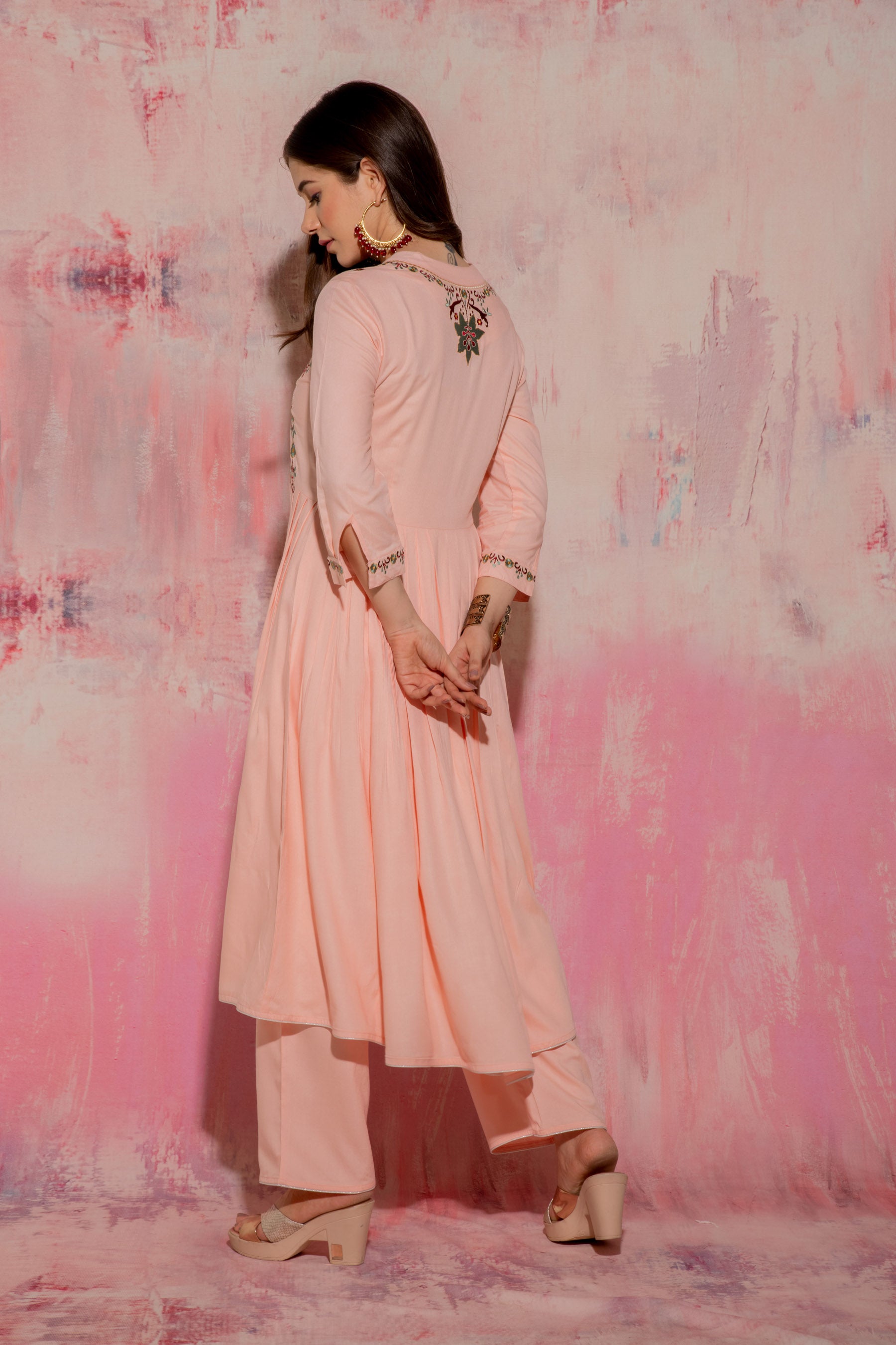 Peach Pure Viscose Kurta With Embroidery & Yoke Paired Pants