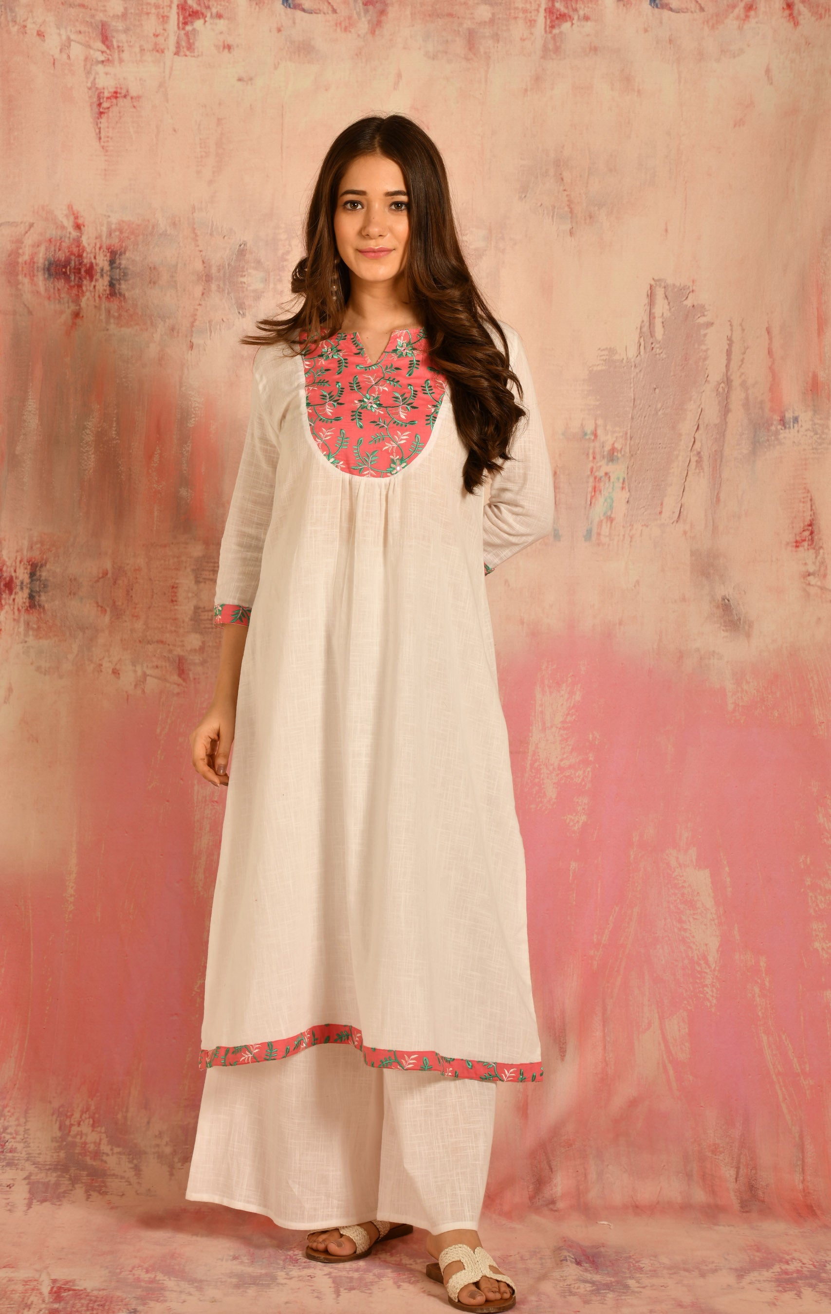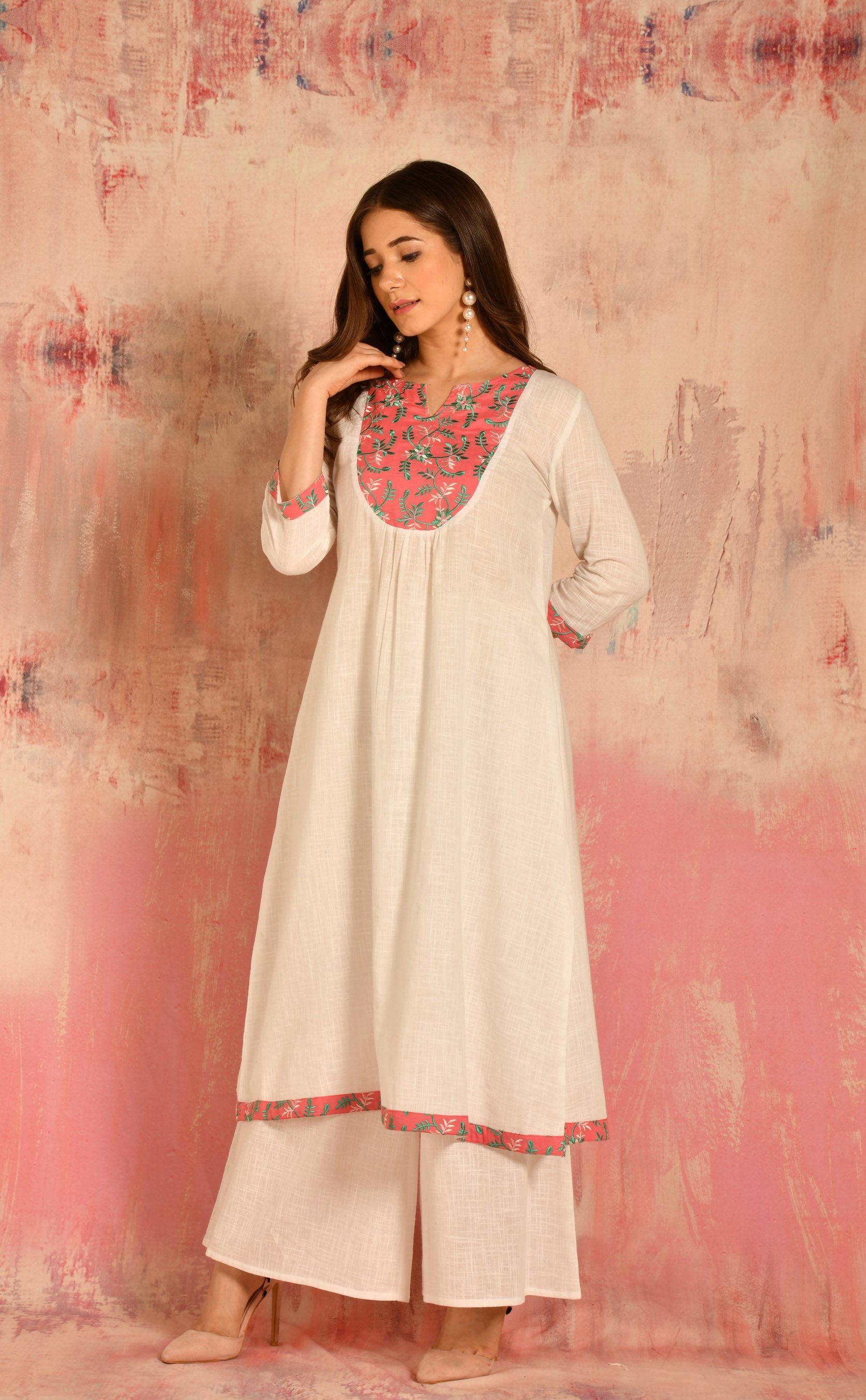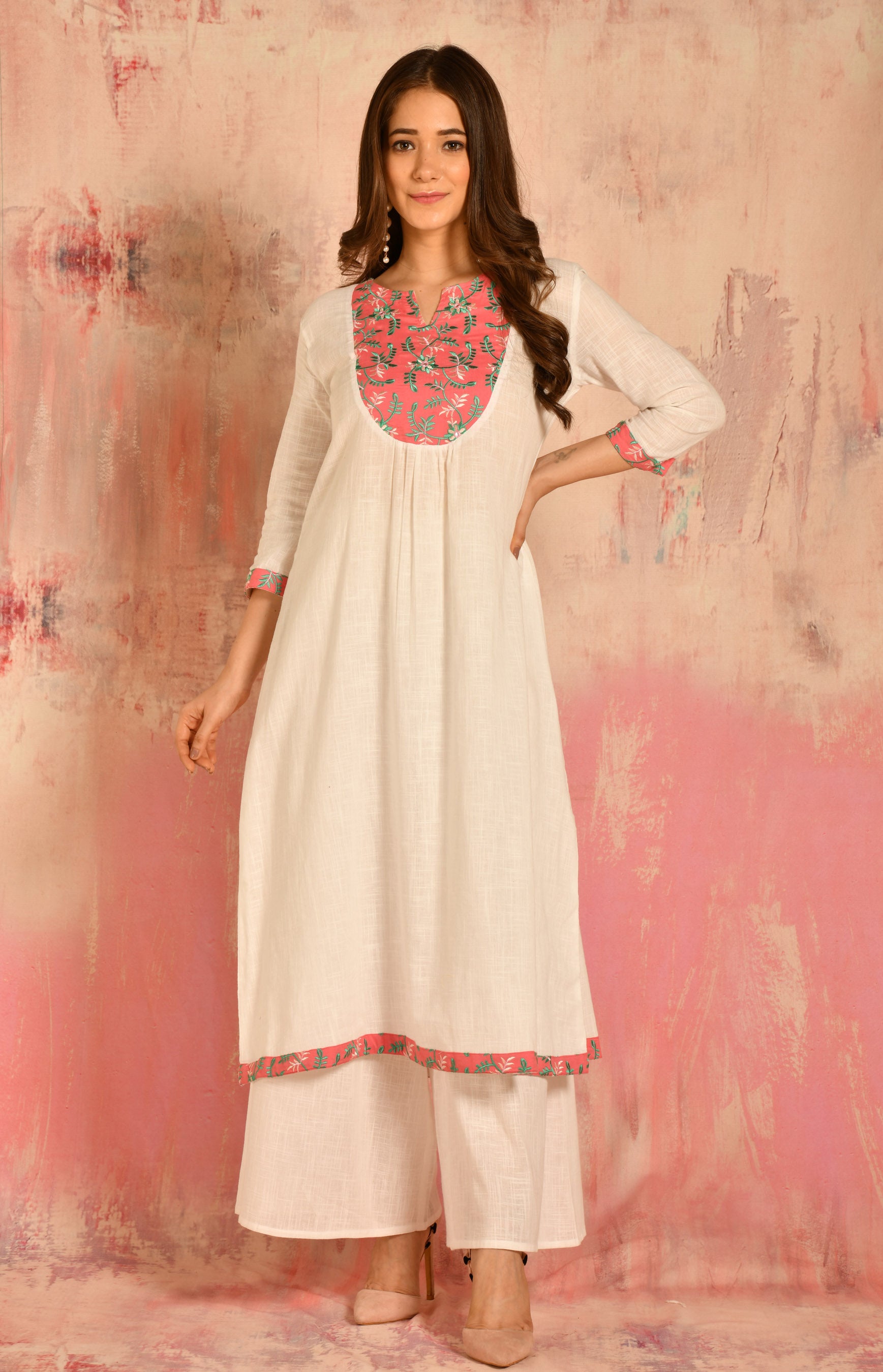 • Pattern: A-line cotton kurta with embroidered yoke details paired up with Pallazo.