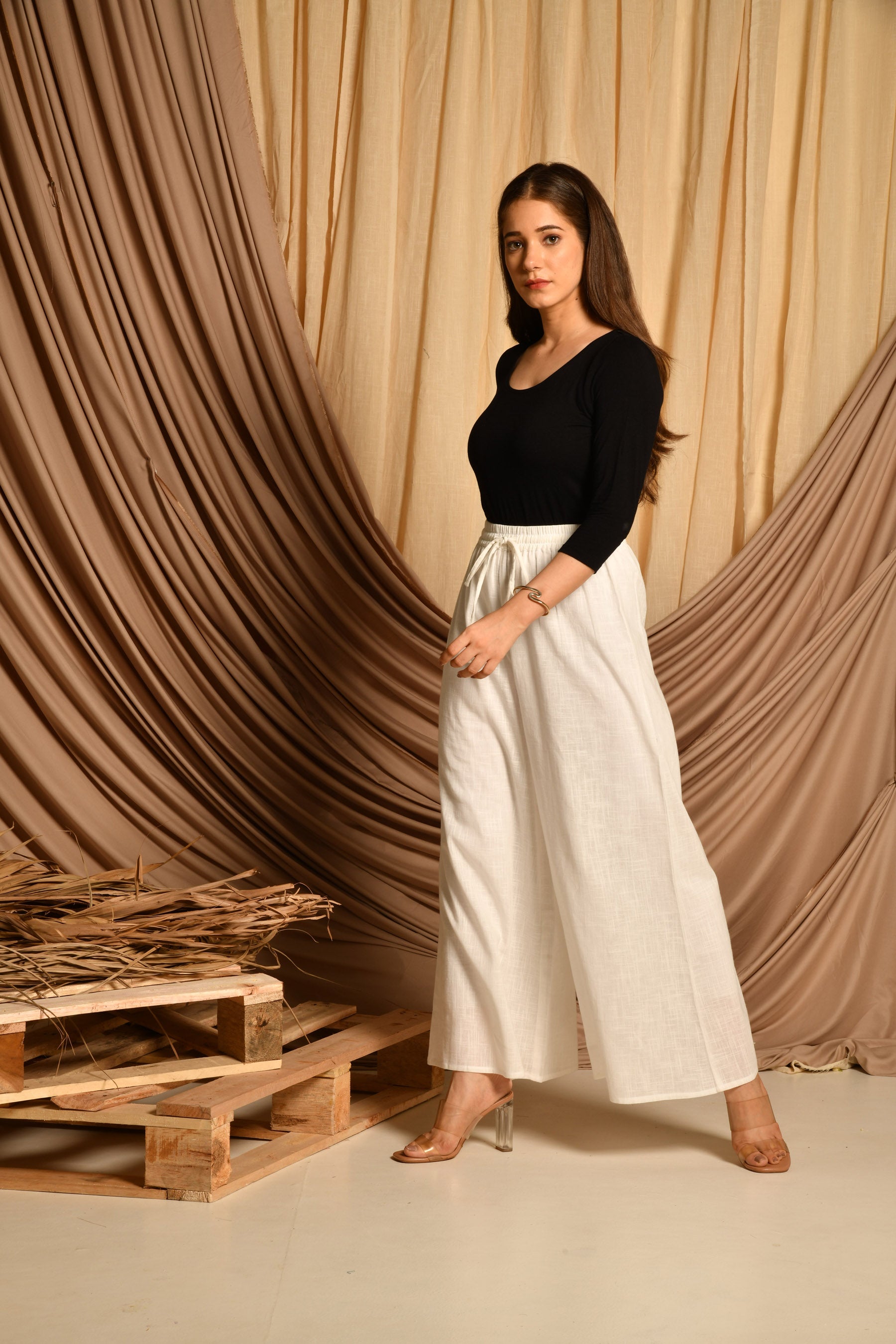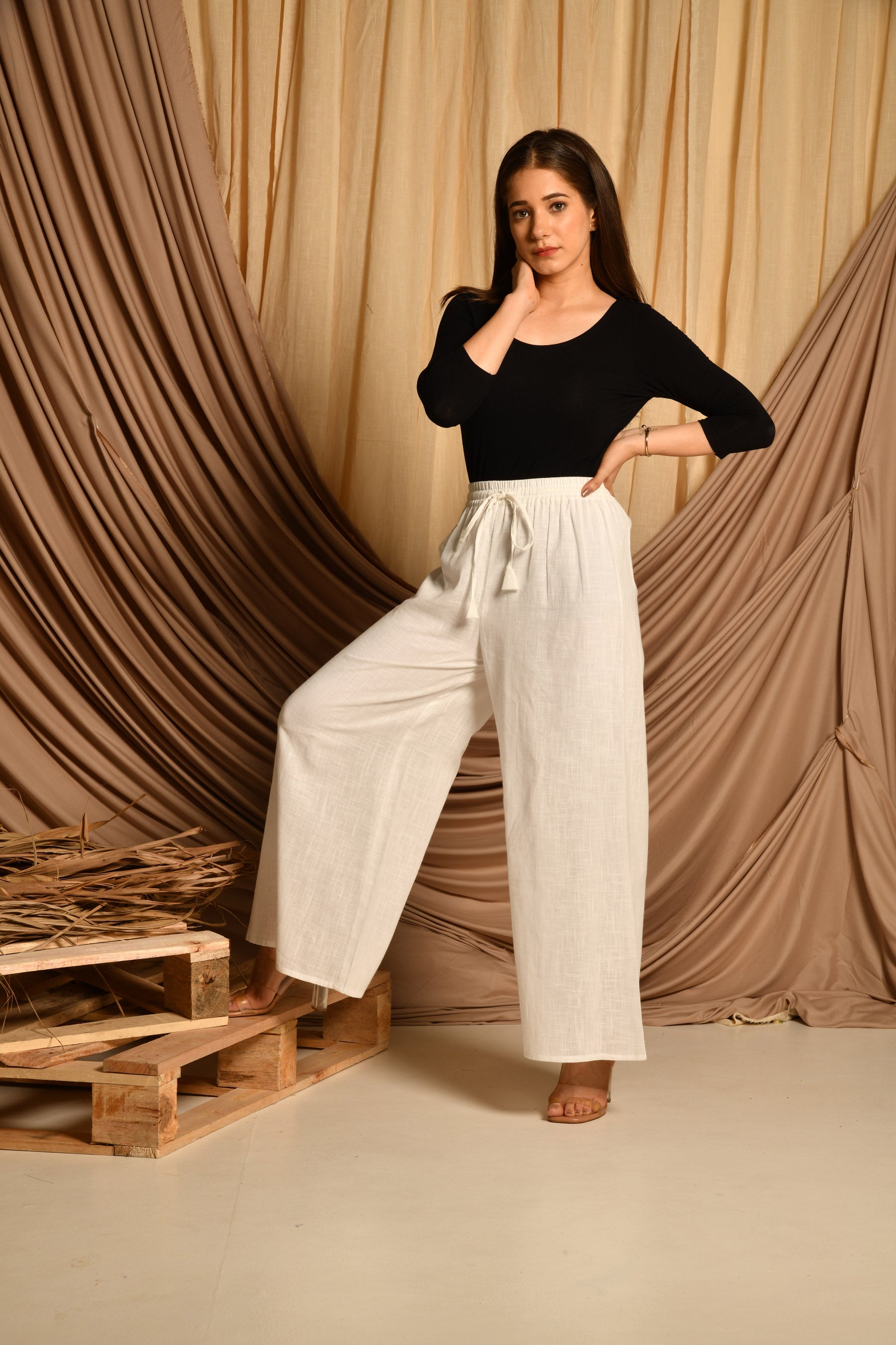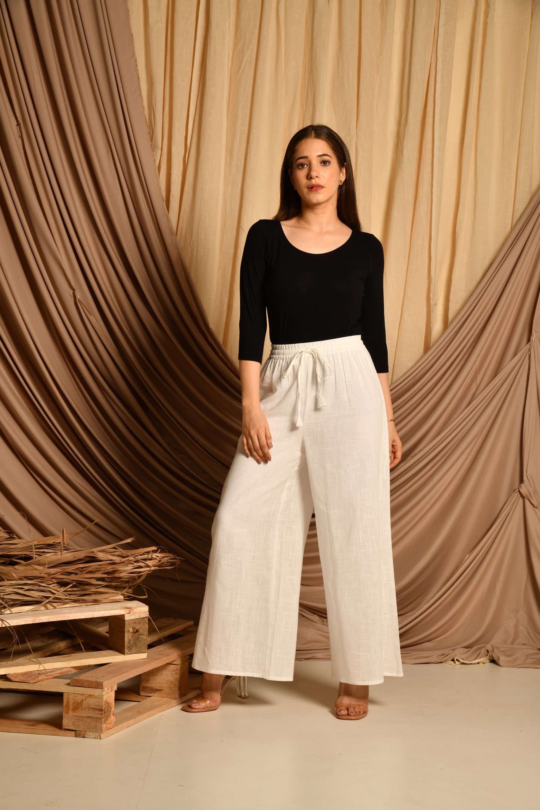 • Pattern: White cotton pallazo with elasticated belt and drawstring.