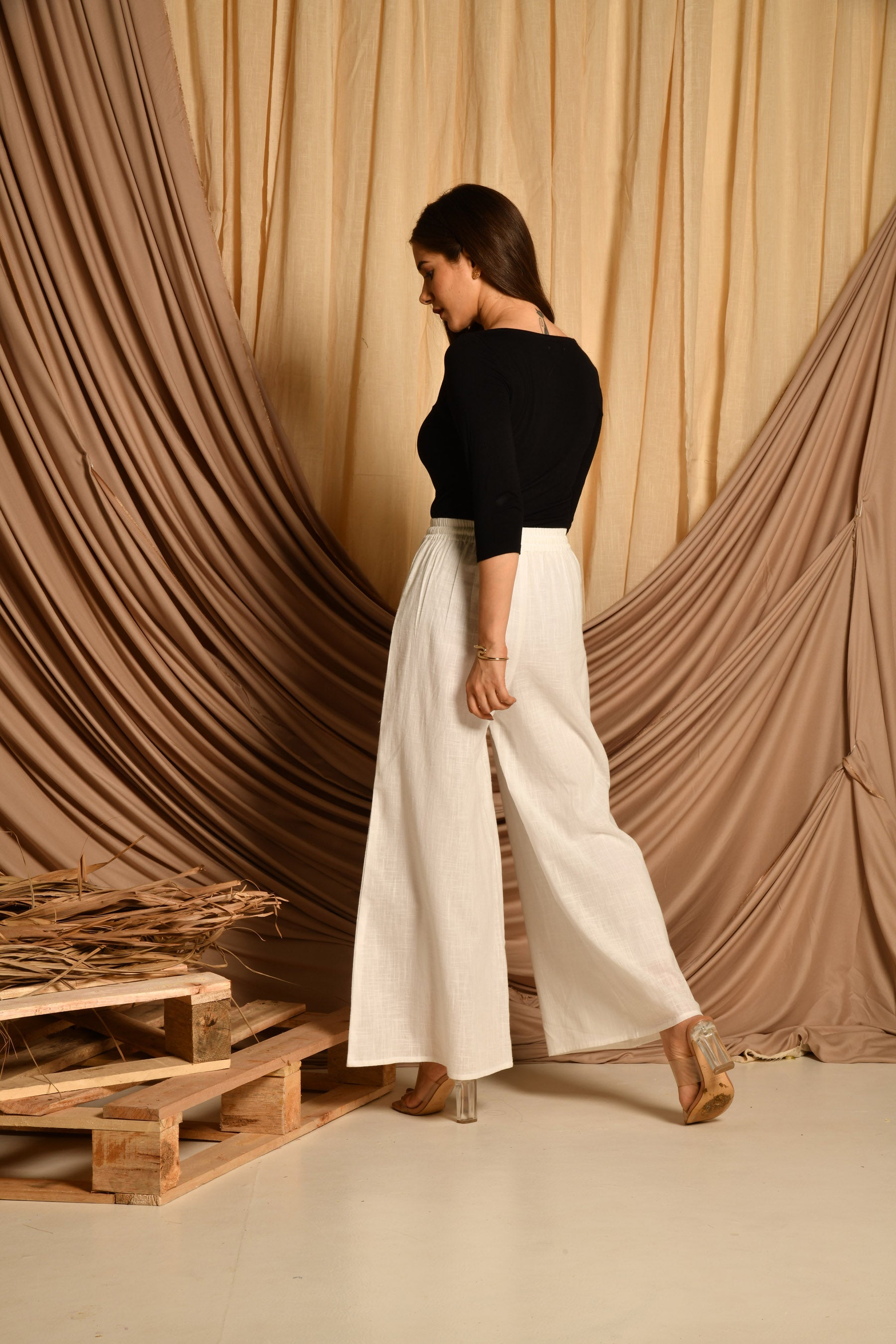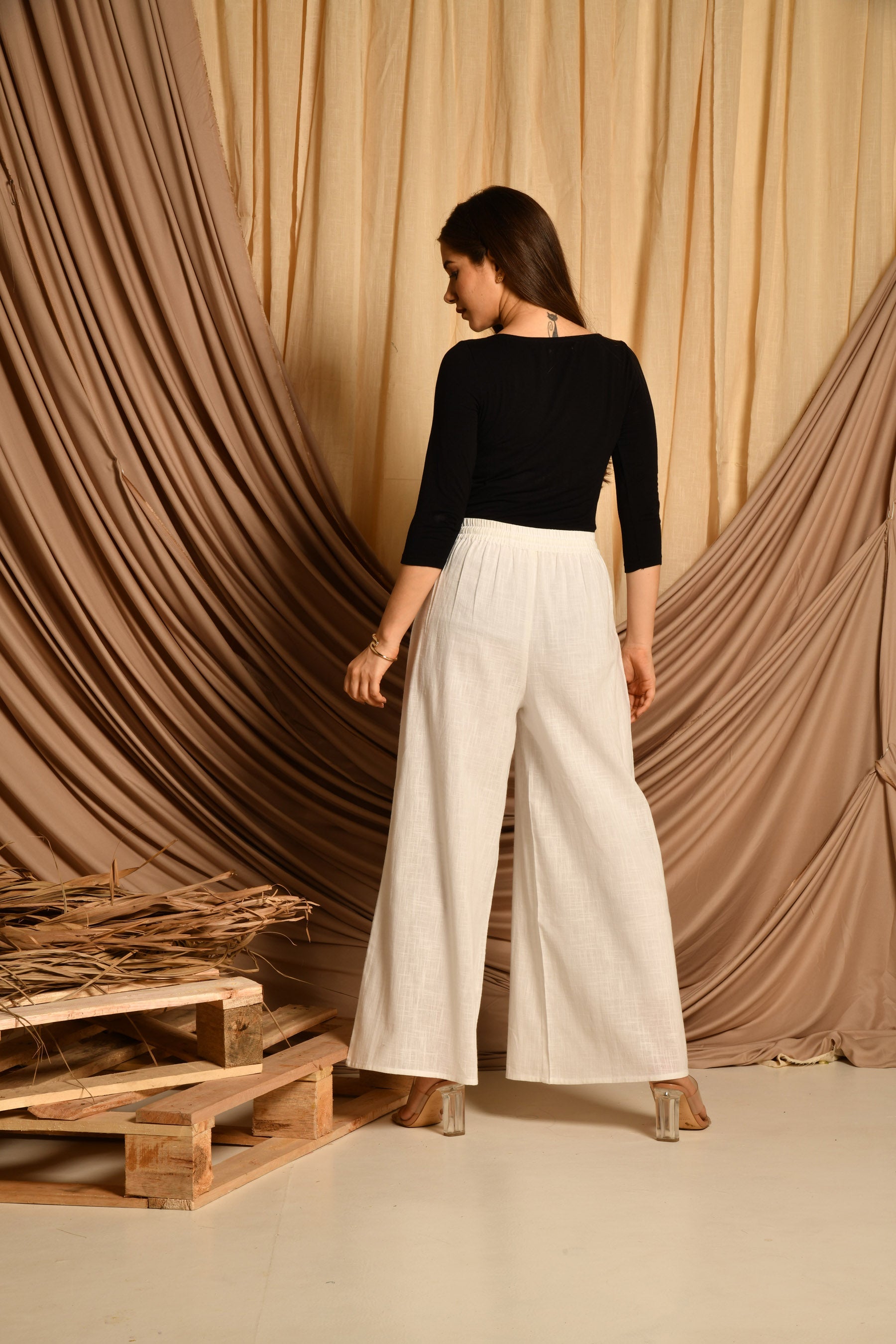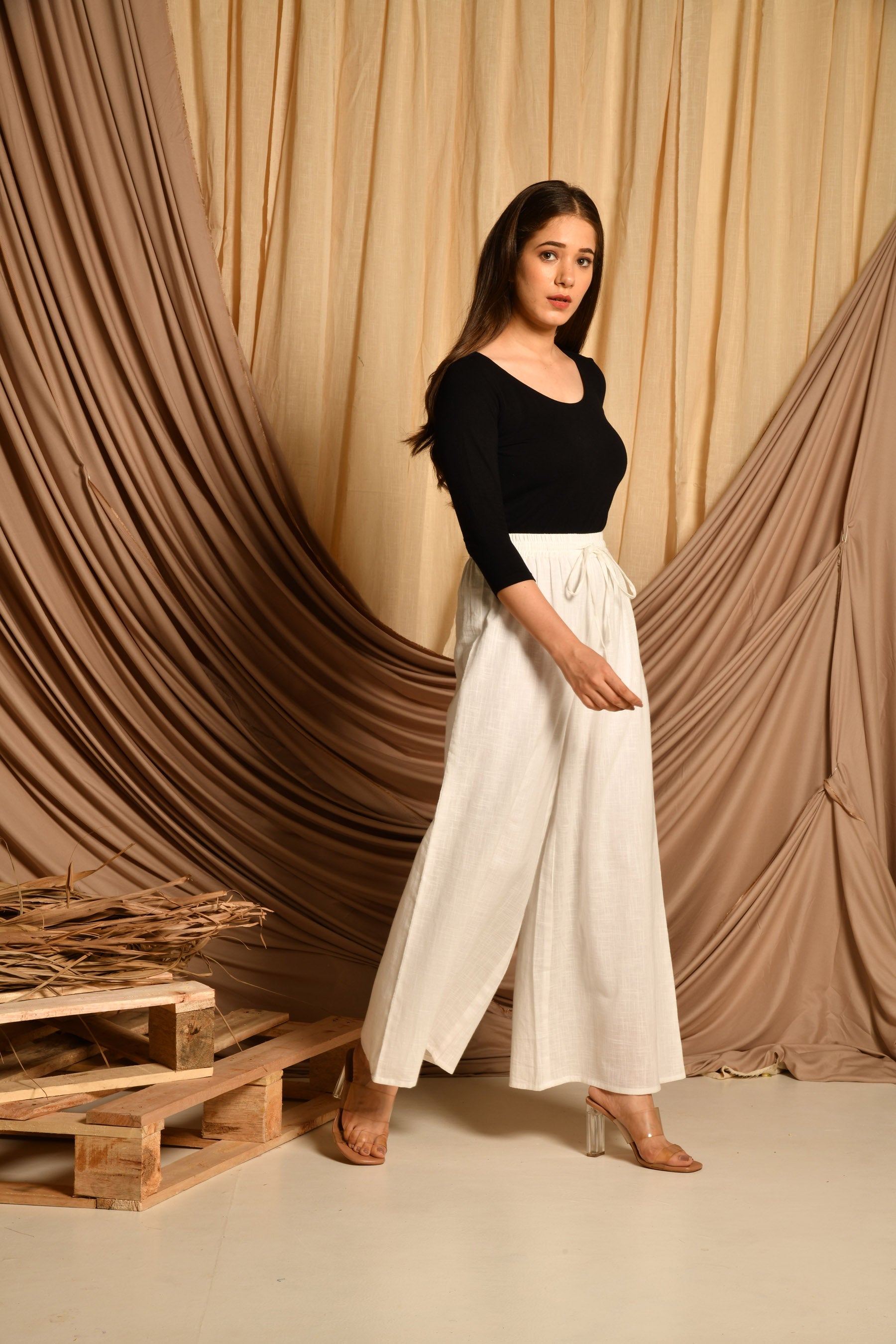 • Pattern: White cotton pallazo with elasticated belt and drawstring.