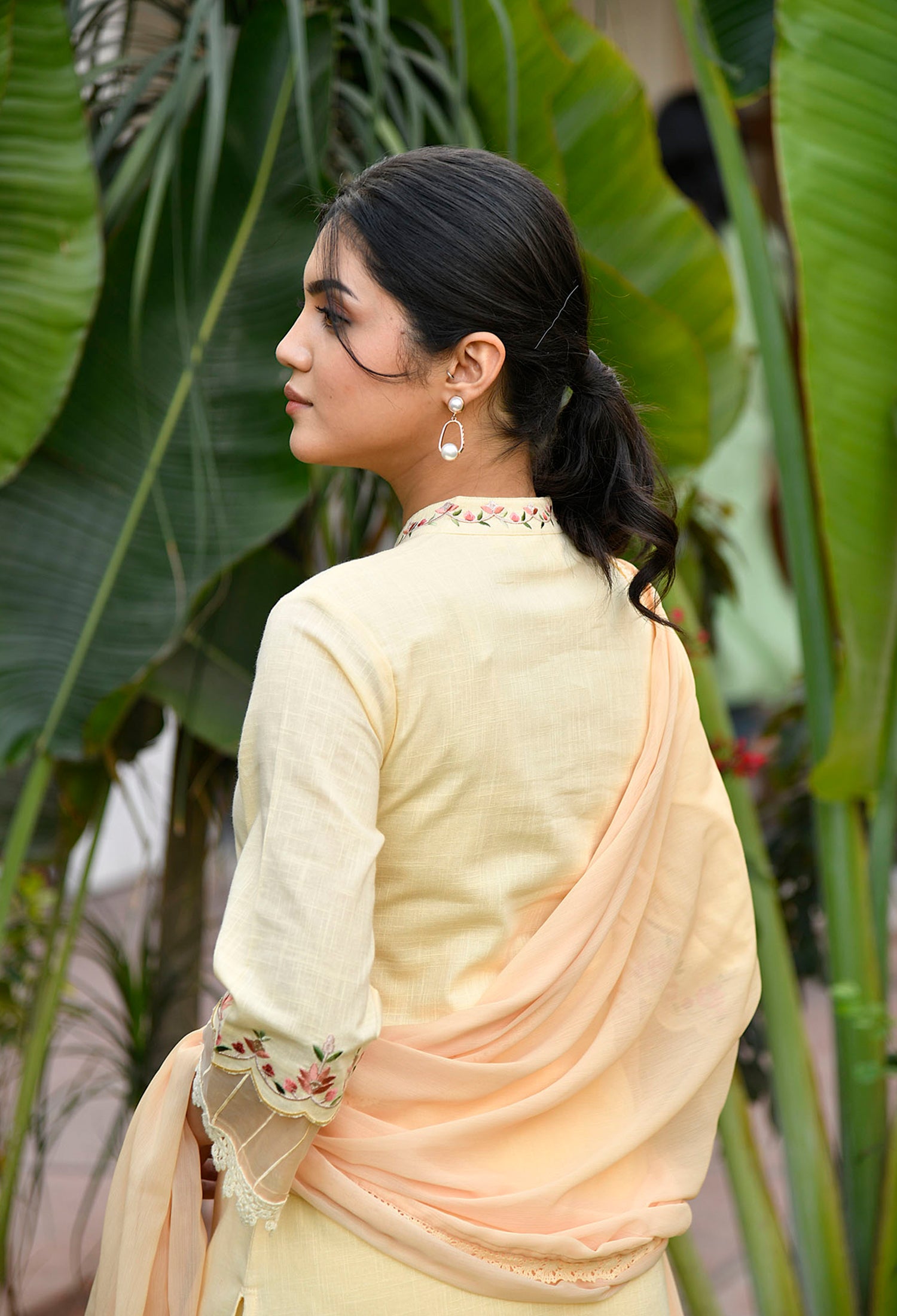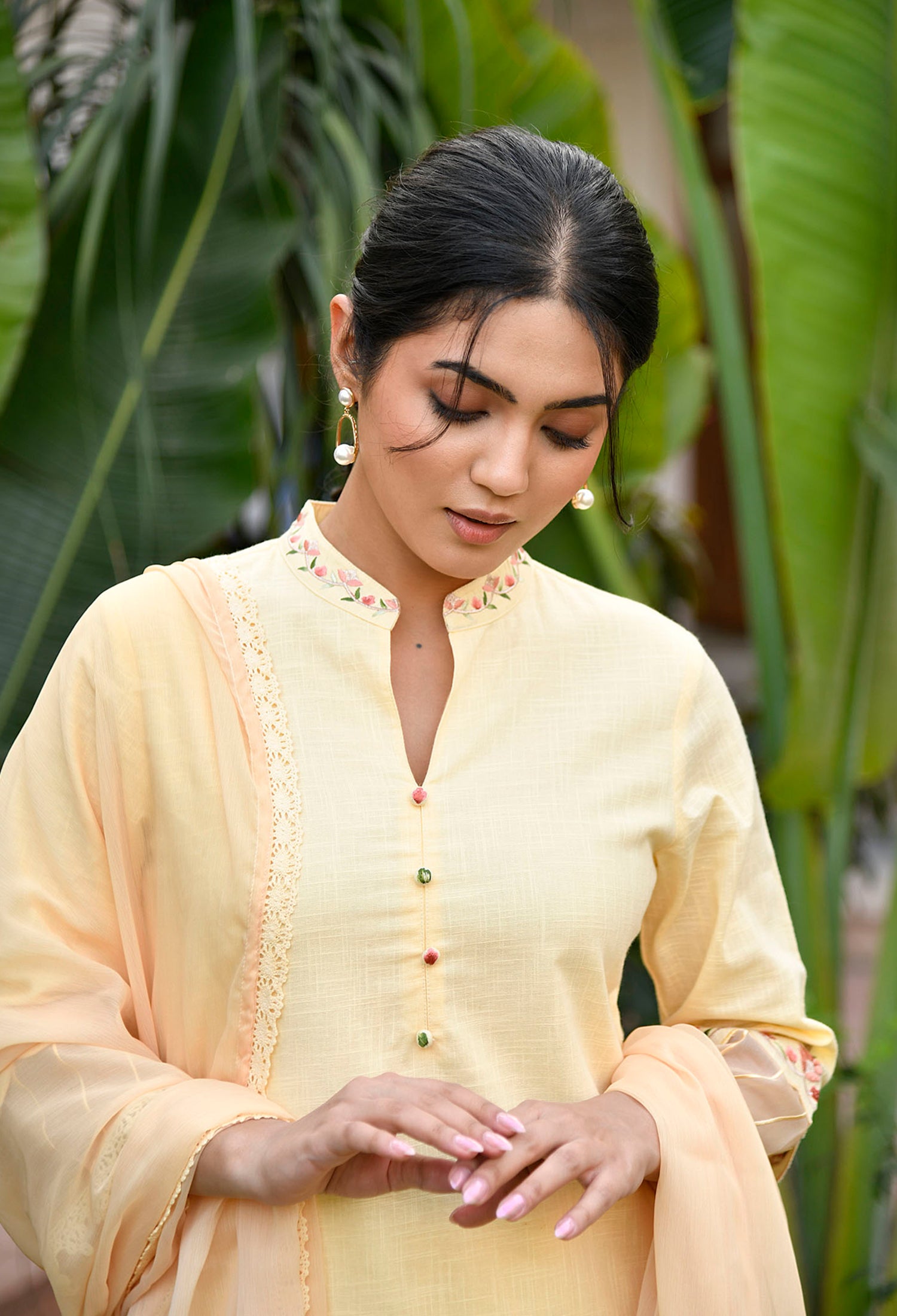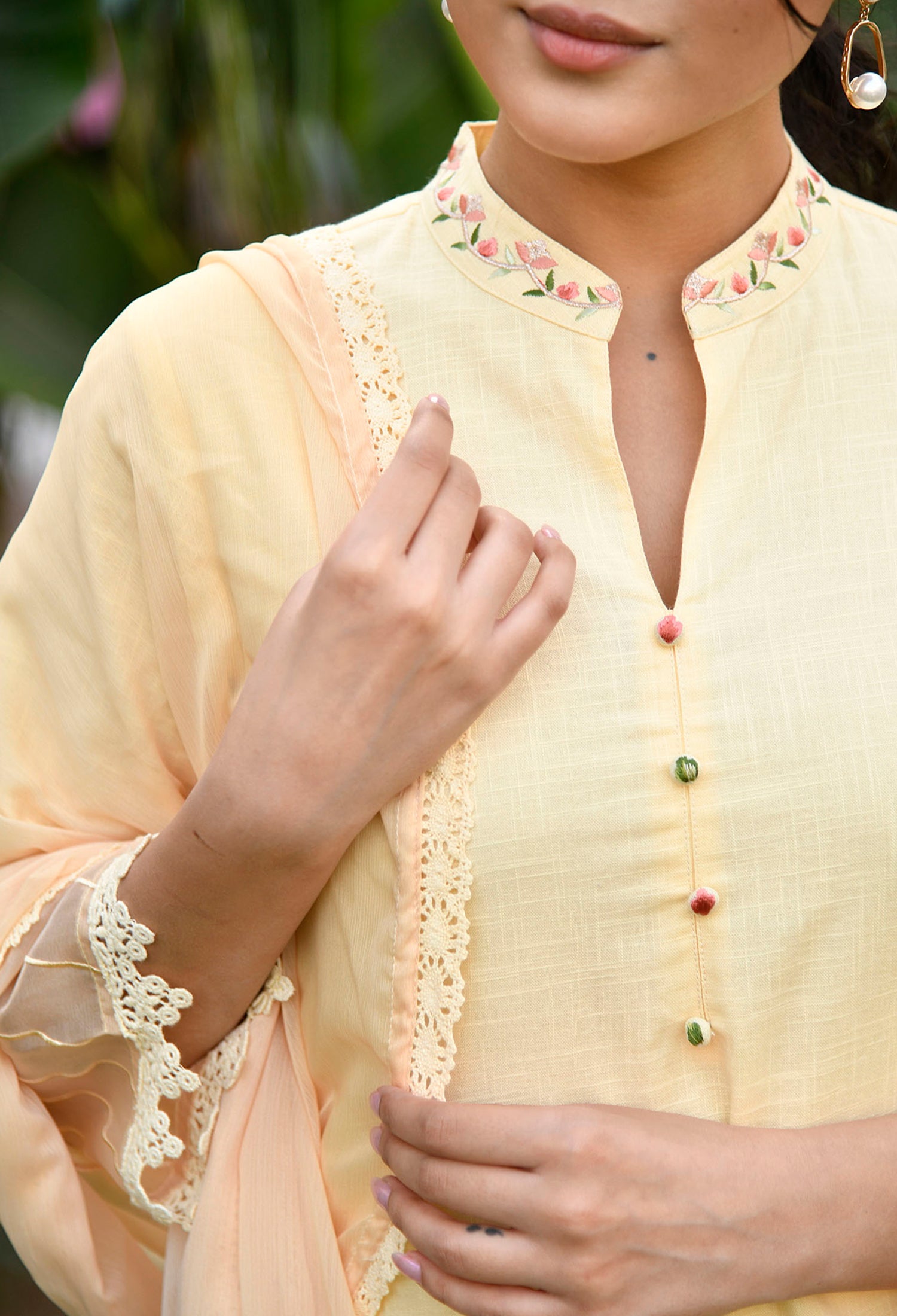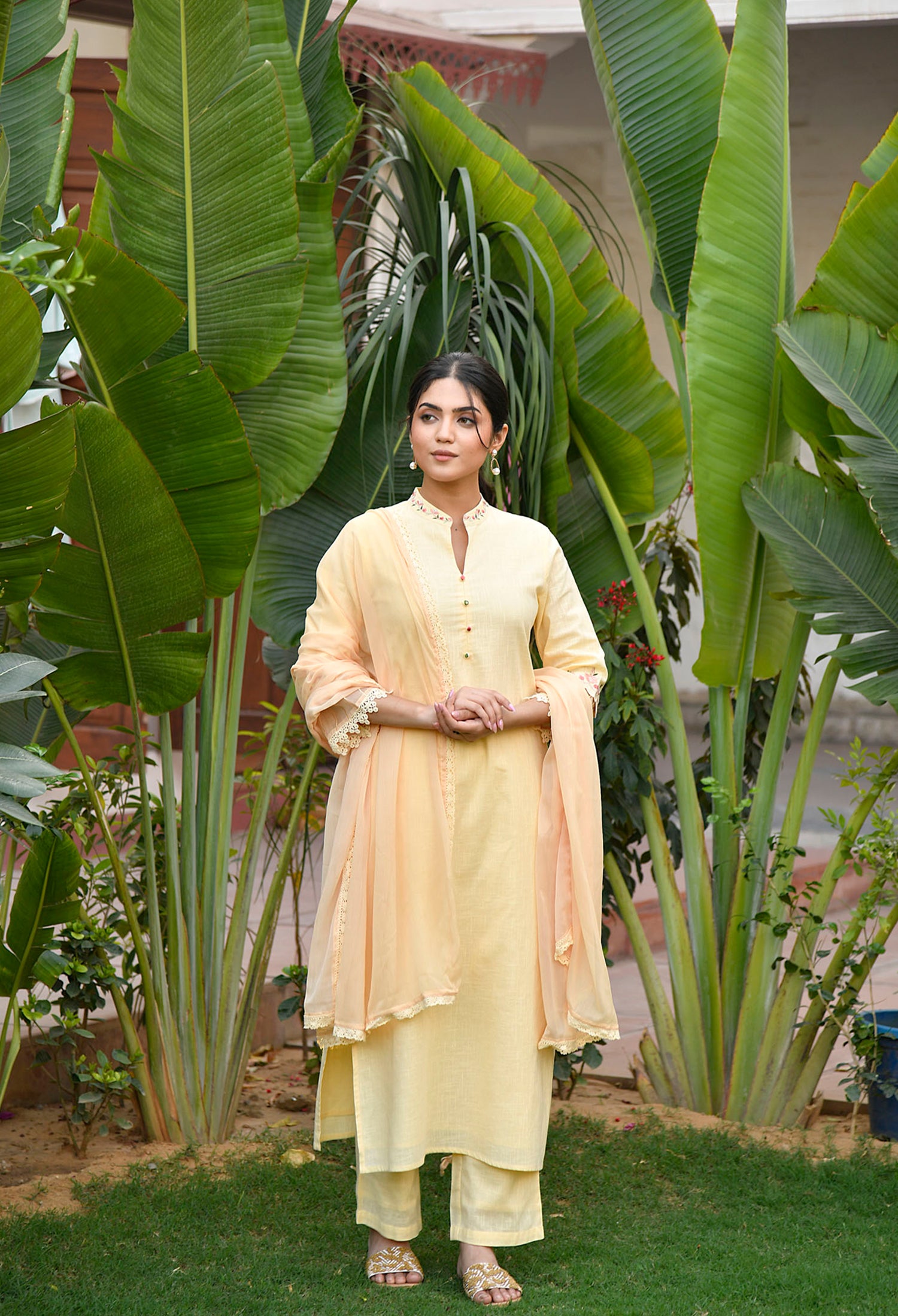 • Pattern: Straight Fit Embroidered collar kurti with organza detail and straight fit pants and chiffon dupatta