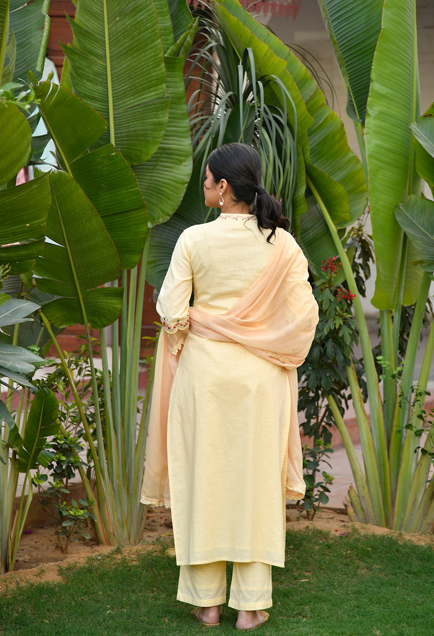 Cotton Yellow Straight Fit Embroidered Collar Kurta Set